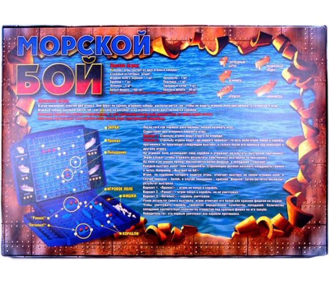 - Комплектация 2 игровых поля с экраном; 2 крейсера; 6 эсминцев; 320 белых фишек; 2 авианосца; 2 подлодки; 8 торпедных катеров; 80 красных фишек