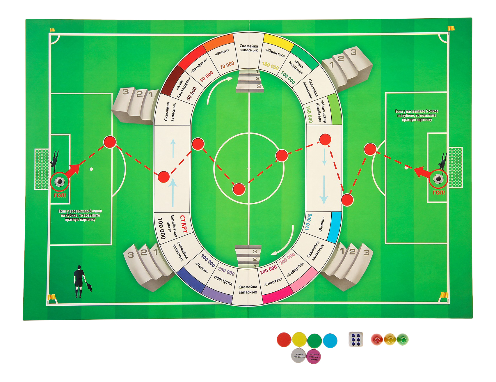 - Комплектация игровое поле, кубик,4 фишки,30 карточек "Скамейка запасных",31 карточка "Красная карточка",11 карточек "Участники",36 жетонов,деньги,инструкция