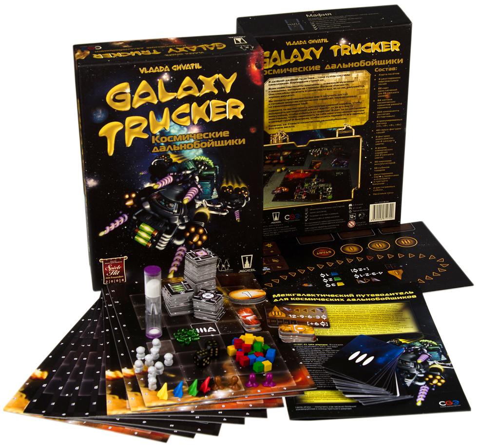 - Комплектация игровое поле; 8 схем; 4 тайла с номерами; 65 космических кредитов; 144 тайла компонентов; 62 карты; 8 маркеров космических кораблей (по два каждого цвета); 40 фигурок космонавтов; 8 фигурок инопланетян (4 желтых и 4 фиолетовых); 36 жетонов батарей; 56 кубиков грузов (красные; зеленые; синие; желтые); 2 шестигранных кубика; песочные часы; книга правил
