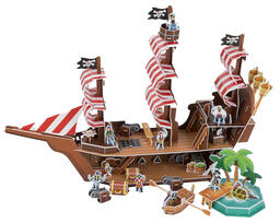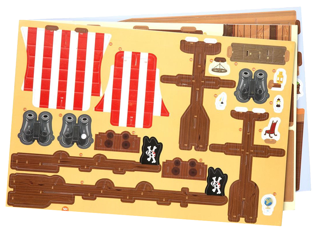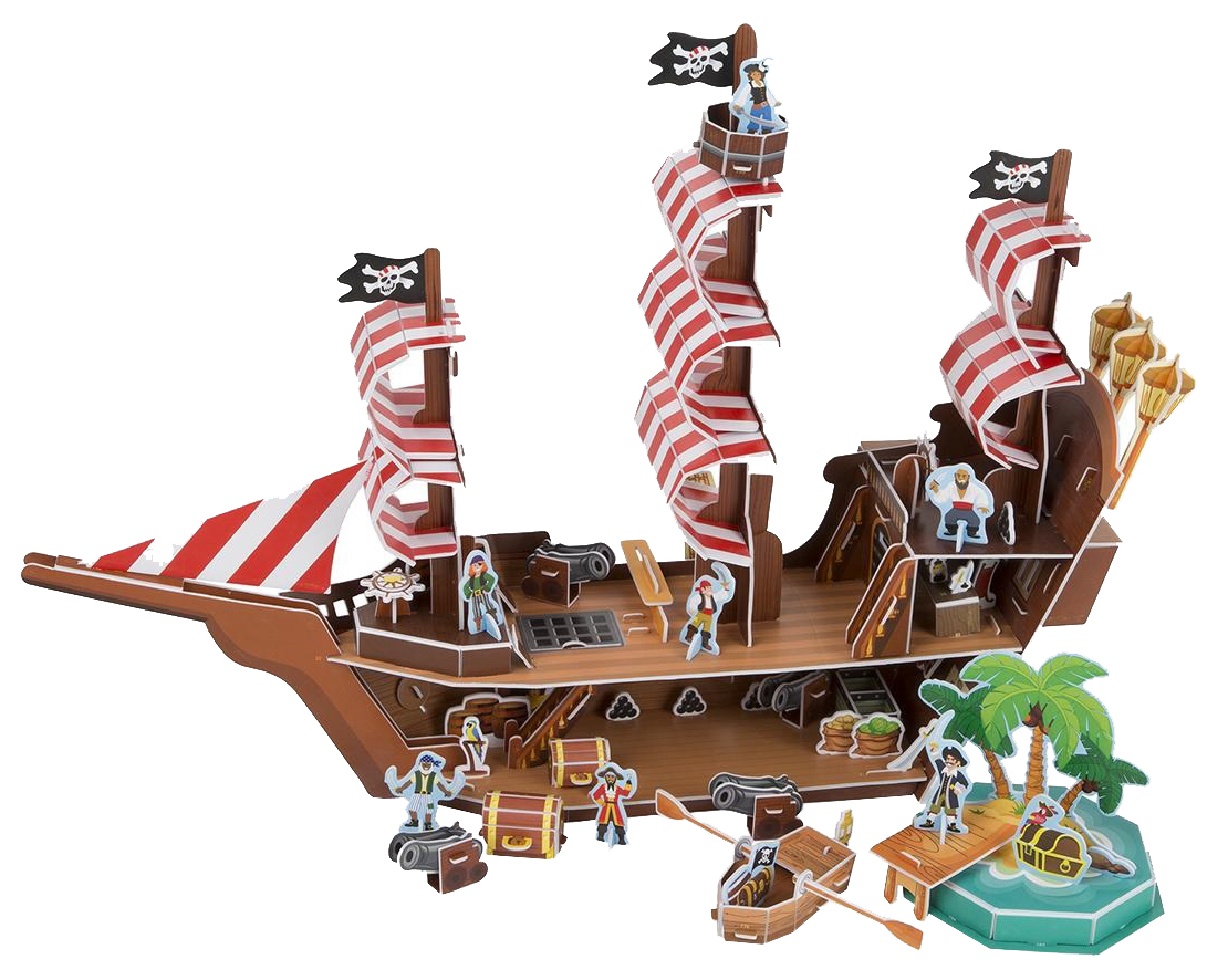 - Комплектация более 100 деталей для сборки корабля, необитаемый остров, лодка, сундук с сокровищами, пираты и другие аксессуары