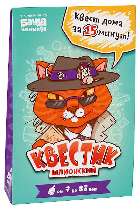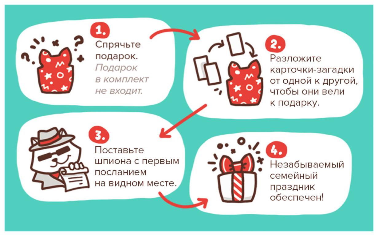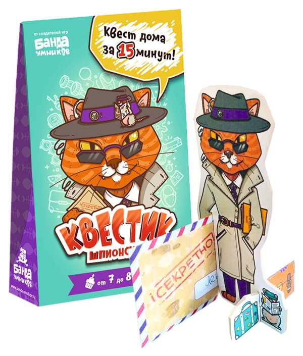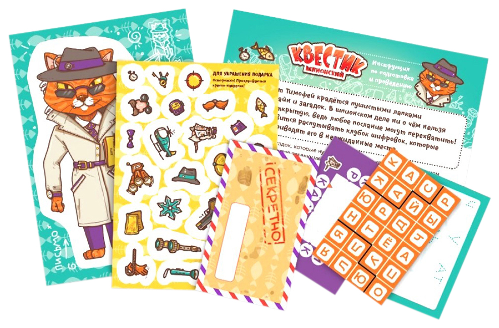 Комплектация2 комплекта наклеек: для украшения подарка и стрелки для навигации; 5 зашифрованных карт-загадок; 5 клейких бирок; 5 конвертов; 6 ключей; Инструкция; Карты с отверстиями; Карты со схемами разгадки; Карты на копировальной бумаге; Полоска с красным цветофильтром; Стартовое письмо; Фигурка кота-шпиона