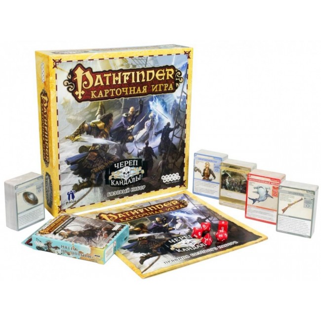 - Комплектация комплектация pathfinder. карточная игра: череп и кандалы 7 карт персонажей 7 карт ролей 7 карт местоположения 1 карта дороги приключений 1 карта флота 377 карт приключения «добыча или смерть» 5 кубиков правила игры состав расширения «мятеж на „полыни“» (входит в базовую игру) 110 карт приключения «мятеж на „полыни“»: 1 приключение 5 сценариев 5 локаций 1 корабль 6 злодеев 20 прислужников 13 монстров 10 преград 7 оружия 10 заклинаний 4 брони 12 предметов 9 компаньонов 2 трофея 5 благословений