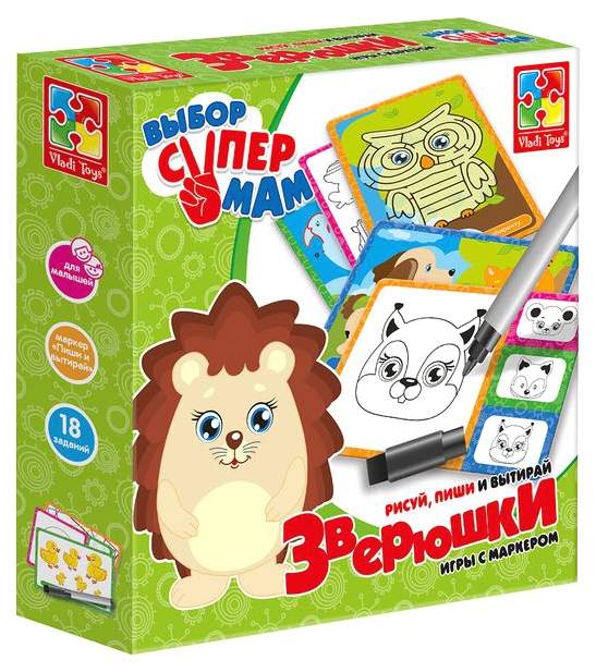 - Комплектация маркер с губкой; 9 двусторонних карточек с заданиями