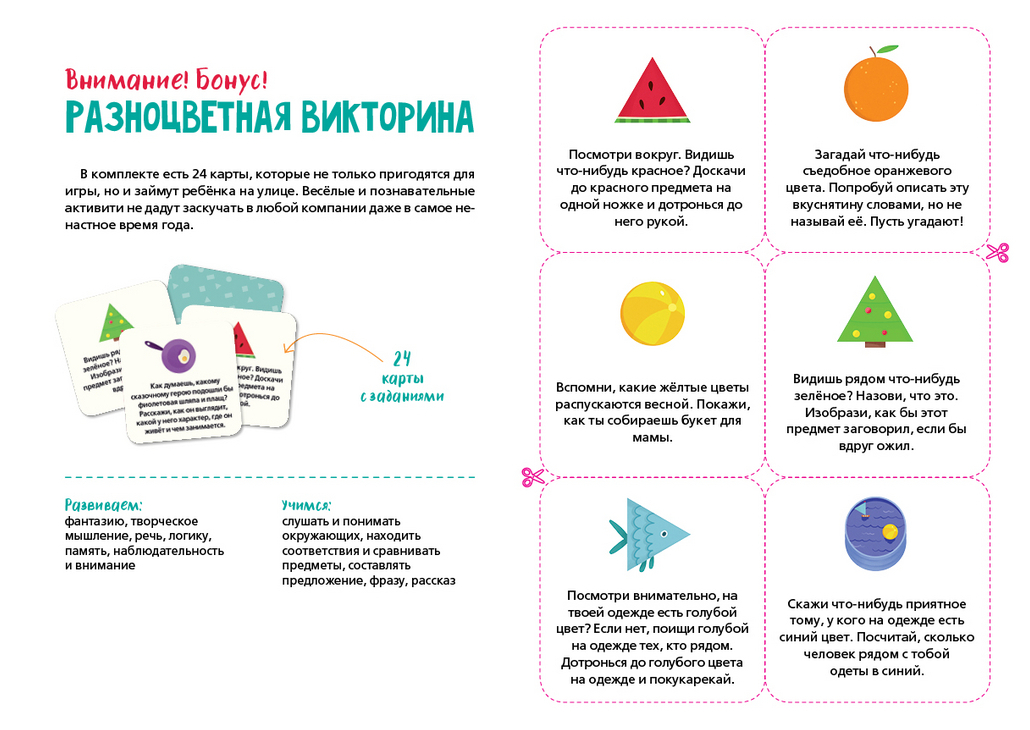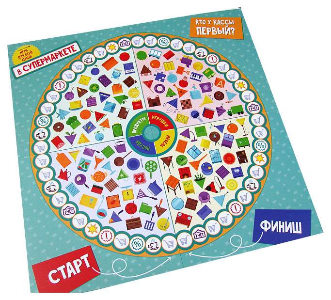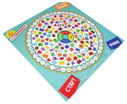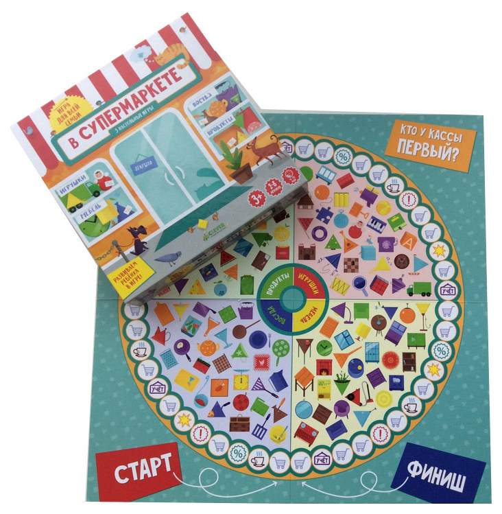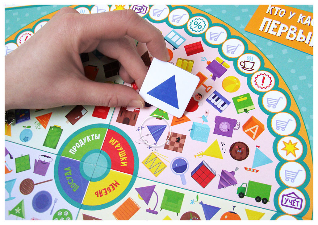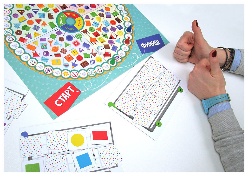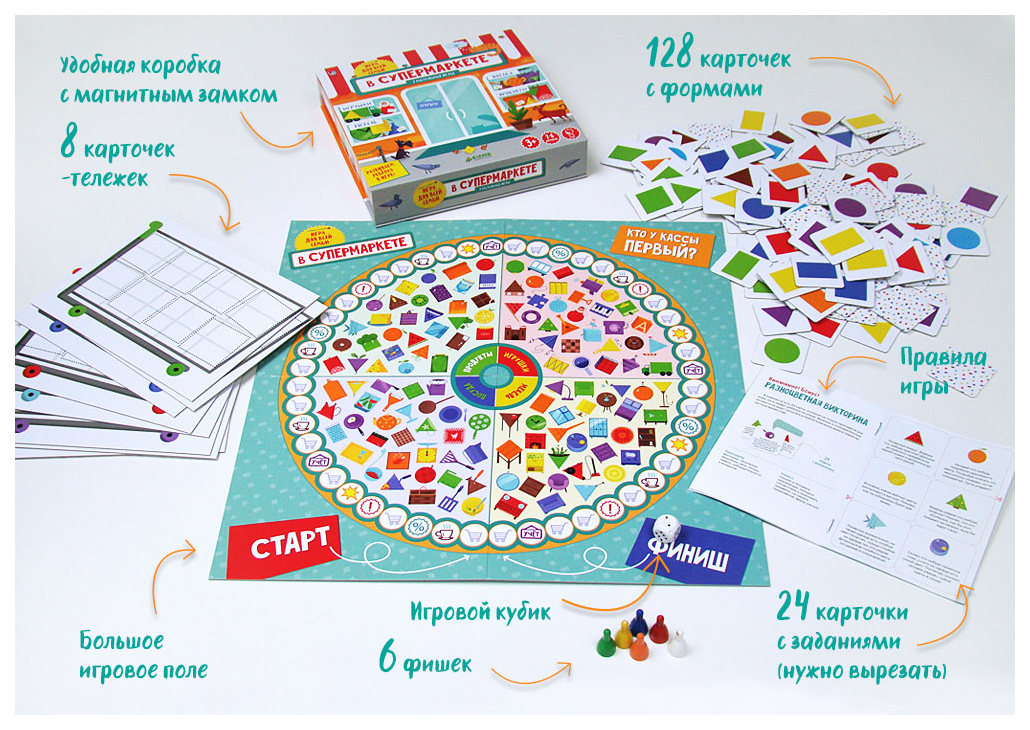 Комплектациябольшое игровое поле; игровой кубик; 6 фишек; 8 карточек-тележек; 24 карточки с заданиями (нужно вырезать); 128 карточек с формами; правила игры