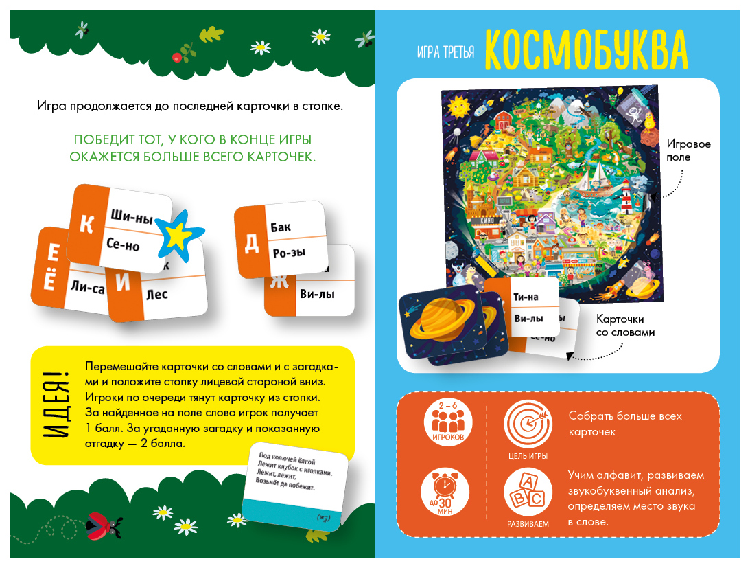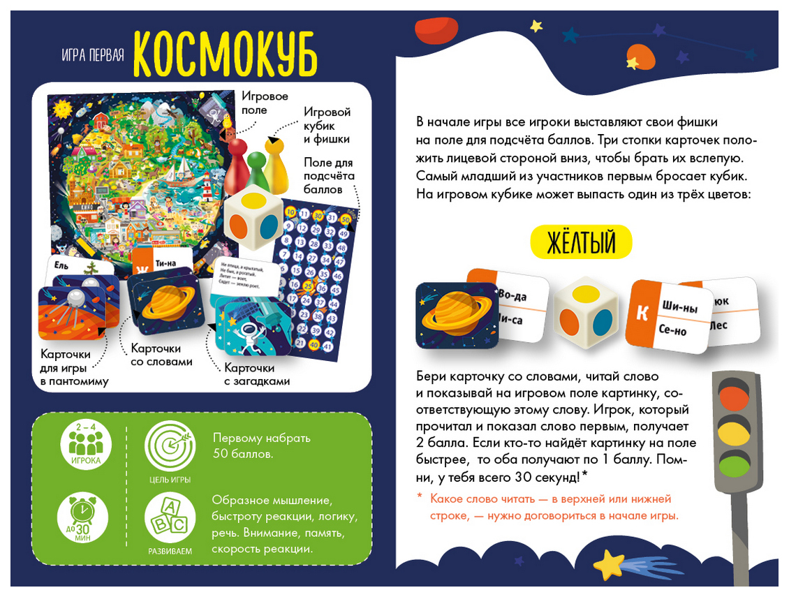 Комплектация8 фишек; 50 карточек с загадками; 50 карточек со словами; 50 карточек для игры в пантомиму; игровой кубик с цветными гранями; игровое поле; поле для подсчета баллов; правила игры; удобная коробка