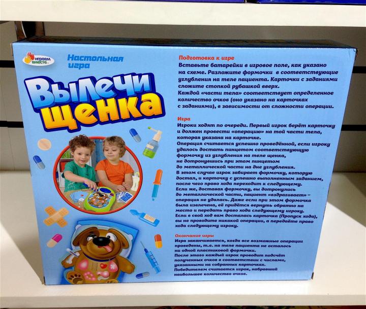 - Комплектация игровое поле (операционный стол с фигуркой щенка); пинцет; 13 органов имитирующих части тела; 15 карточек с заданиями