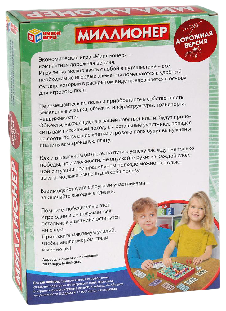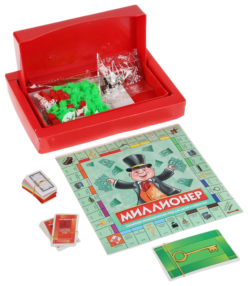 - Комплектация 3 кубика; 44 объекта недвижимости; 6 игровых фишек; Игровые деньги; Инструкция; Карточки; Самоклеящееся игровое поле