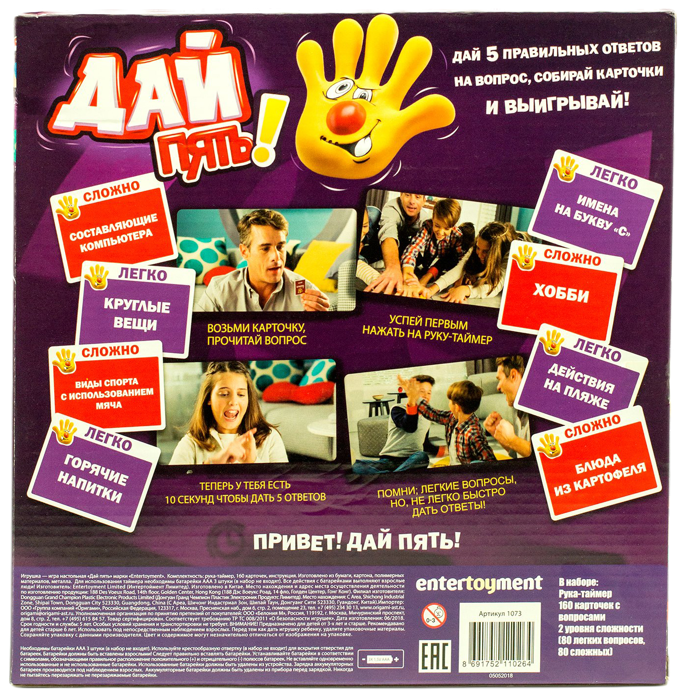 - Комплектация 160 карточек с вопросами; Рука-таймер