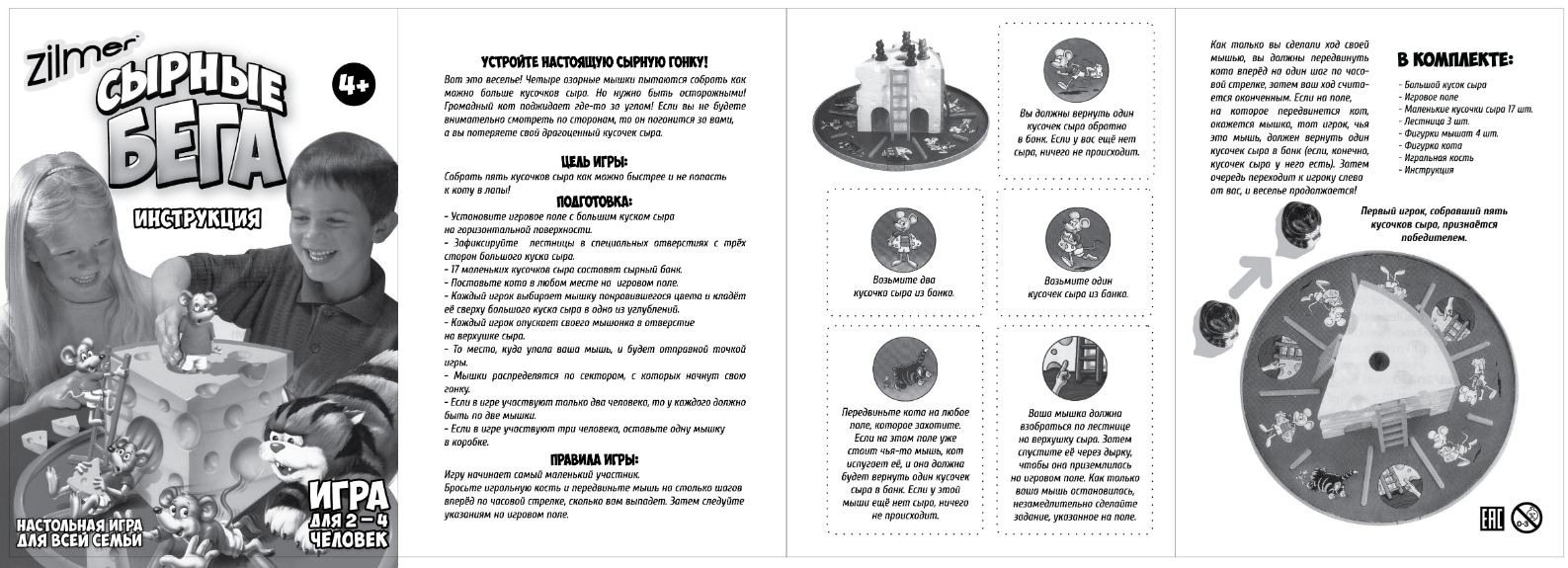 - Комплектация 1 пластиковый большой кусок сыра; игровое поле; 17 кусочков сыра; 3 лестницы; 4 мышки разных цветов; 1 кот; 1 кубик; инструкция