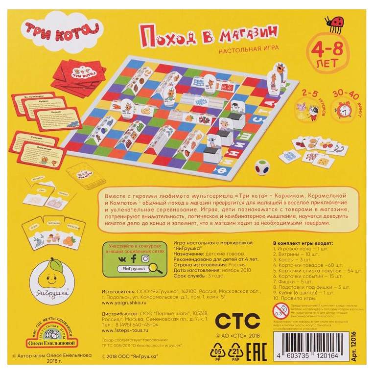 • Комплектация игровое поле; 10 витрин; кубик; 5 фишек; 3 кассы; 60 карточек товаров; 54 списка покупок; 15 карточек событий; подставки; правила игры