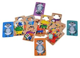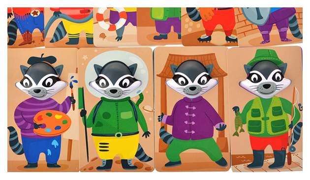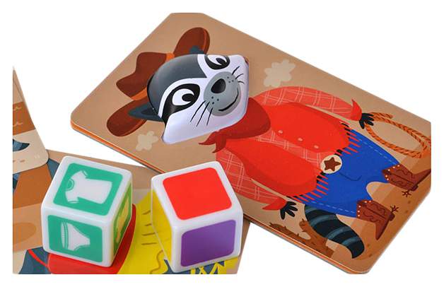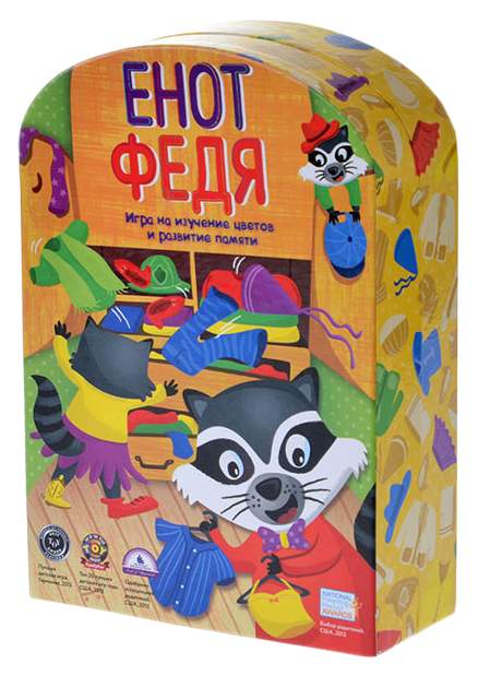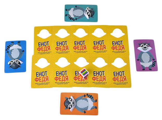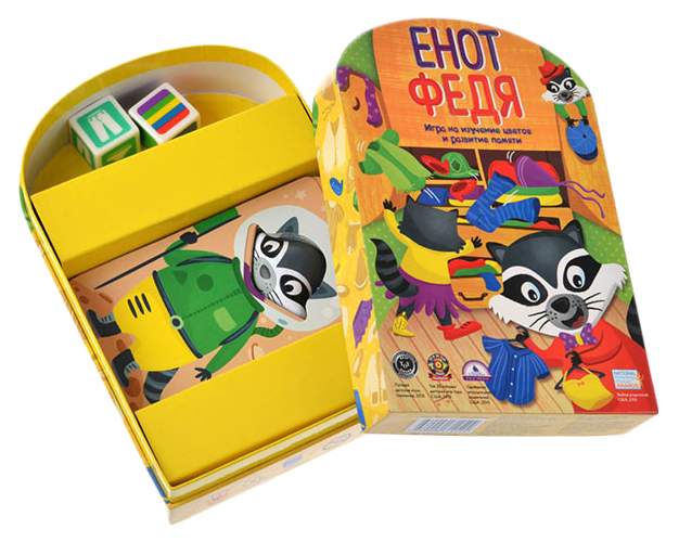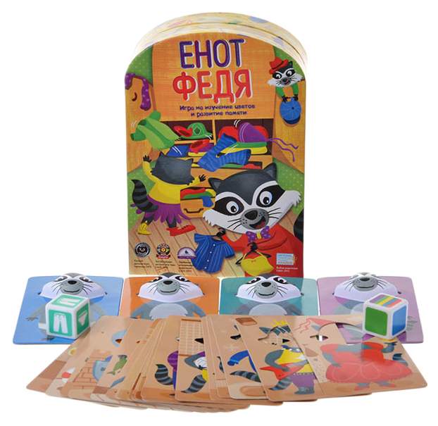 • Комплектация 4 карты с енотами-непоседами; 20 карт с костюмами; Кубик с одеждой; Кубик с цветами; Правила игры