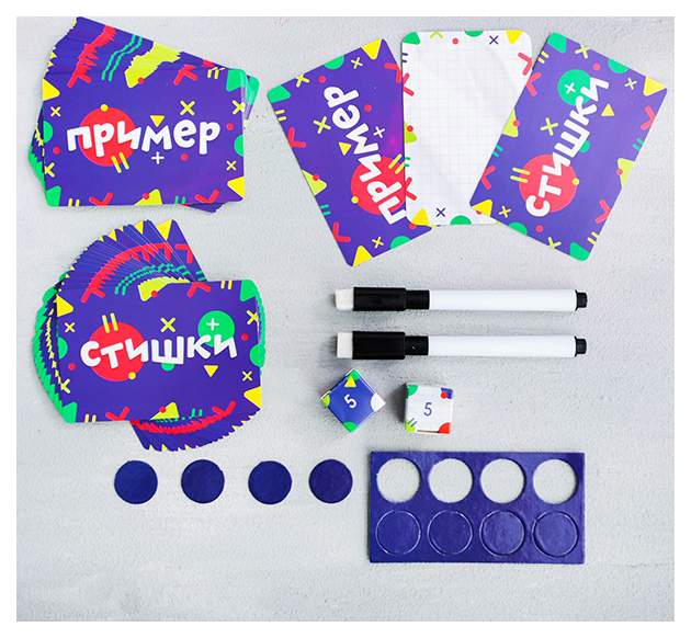 • Комплектация 2 картонных кубика; 2 ламинированных карточки; 2 маркера; 0 жетонов; 20 карточек; Правила игры