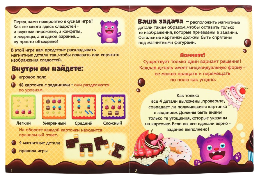 • Комплектация 4 магнитные детали; 48 заданий разной сложности с ответами; Игровое магнитное поле; Правила