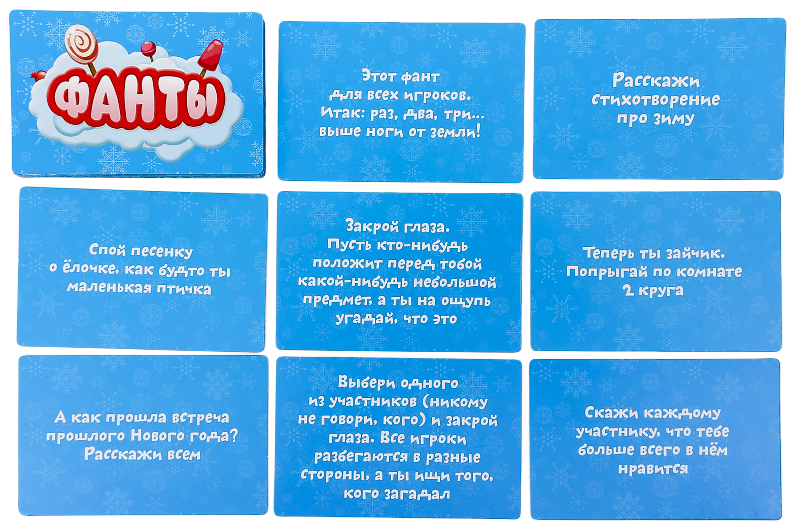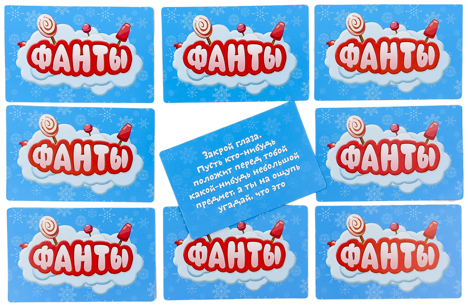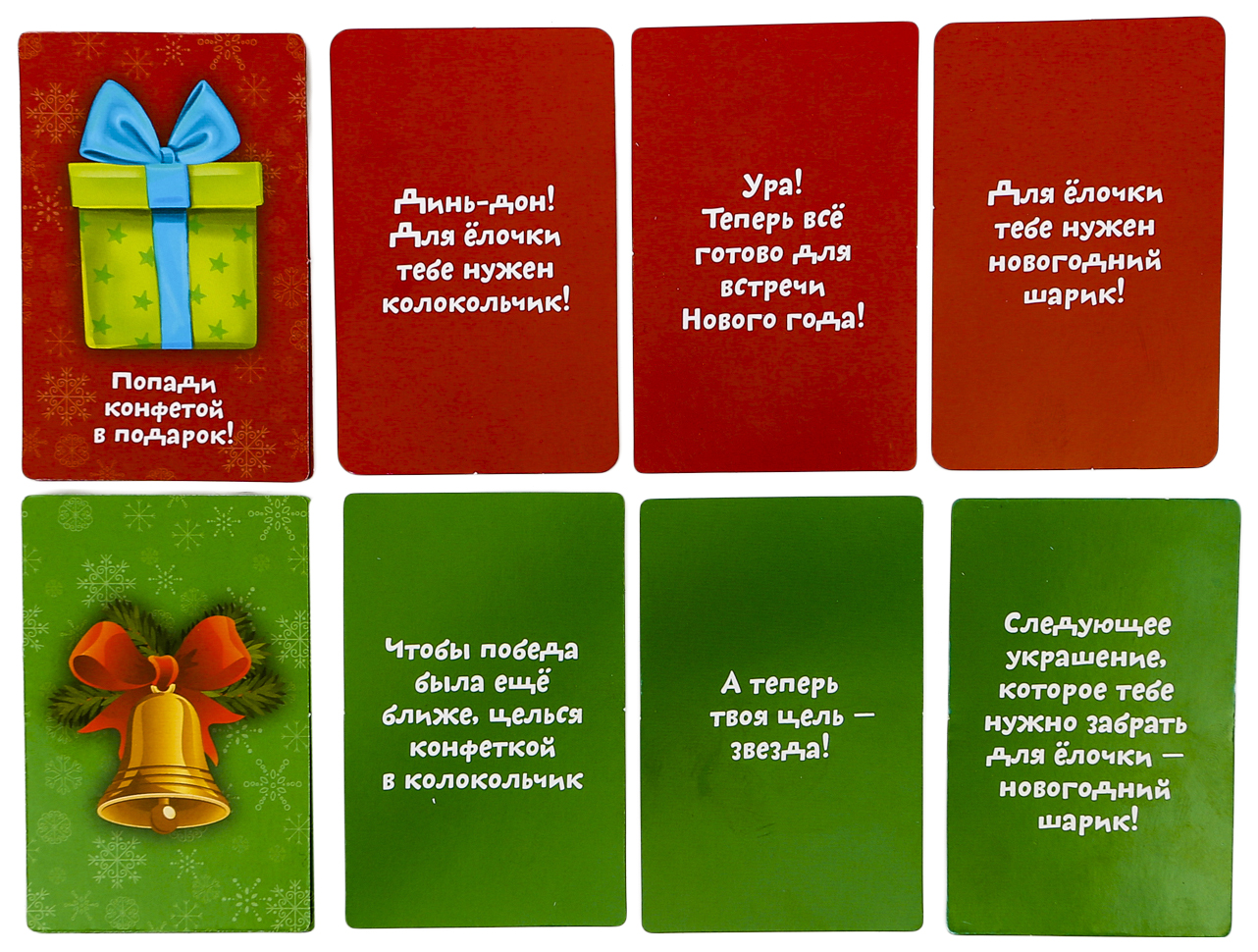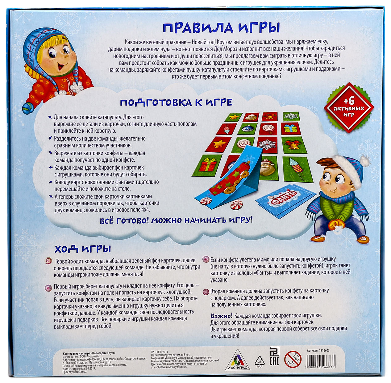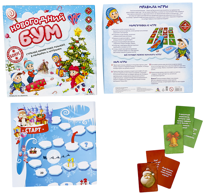 • Комплектация 1 карточка с катапультой и конфетами; 16 карточек с игрушками и подарками; 30 веселых заданий-фантов; 6 активных игр; Правила игры