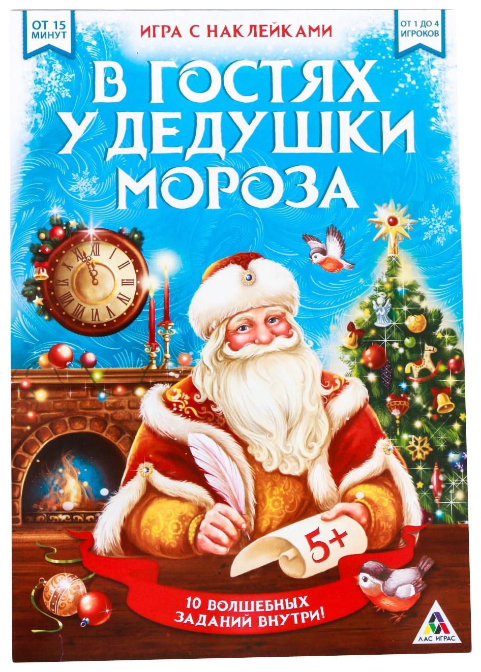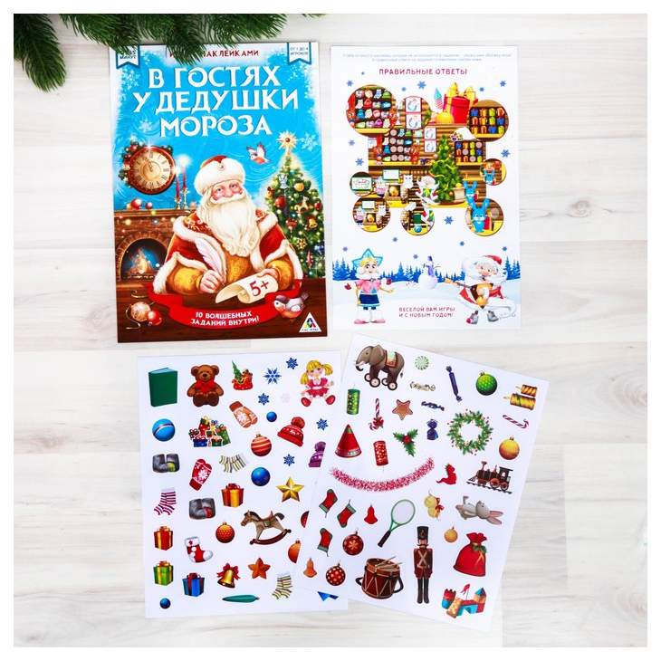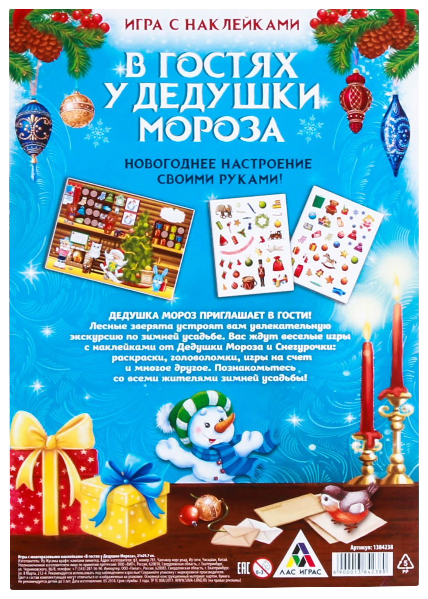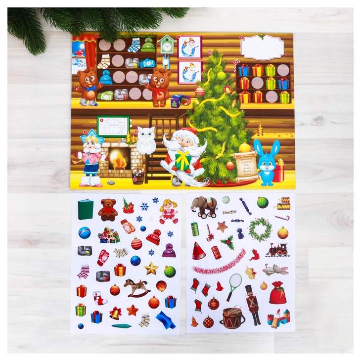 - Комплектация 2 листа с многоразовыми наклейками; Брошюра с письмом от Деда Мороза с забавными заданиями; Игровое поле из плотного картона