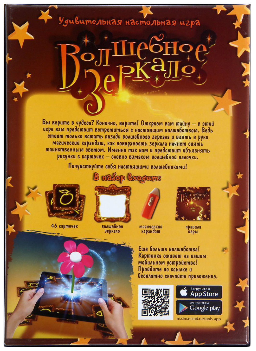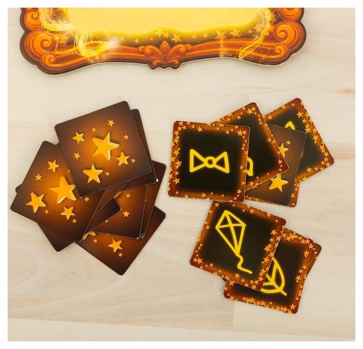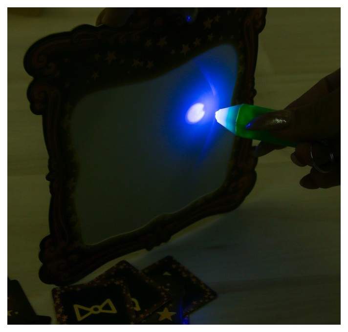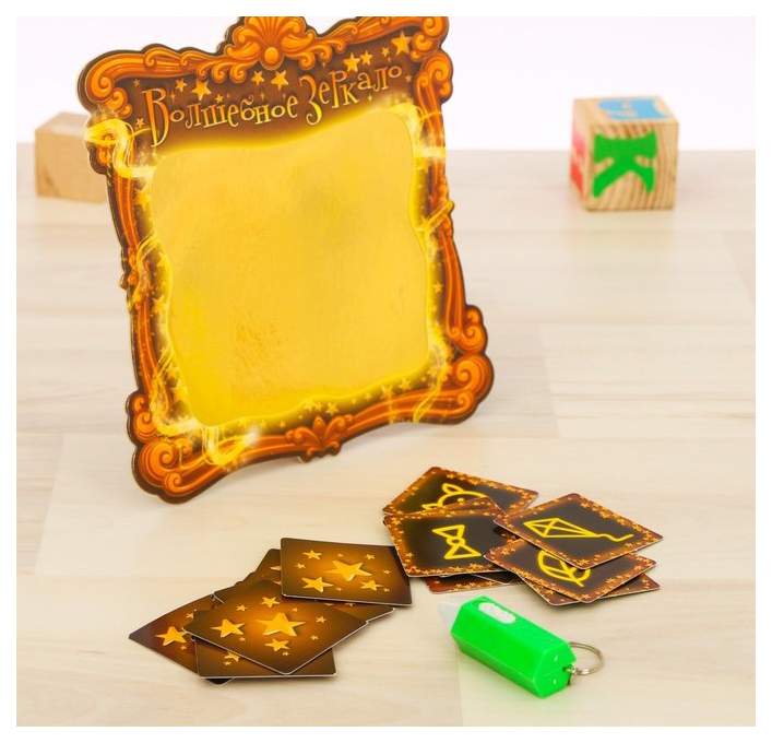 • Комплектация 46 карточек; Зеркало с прозрачной плёнкой; Карандаш-фонарик; Правила игры