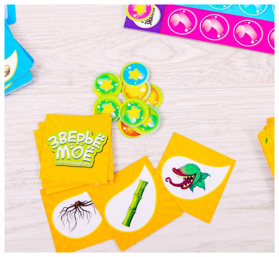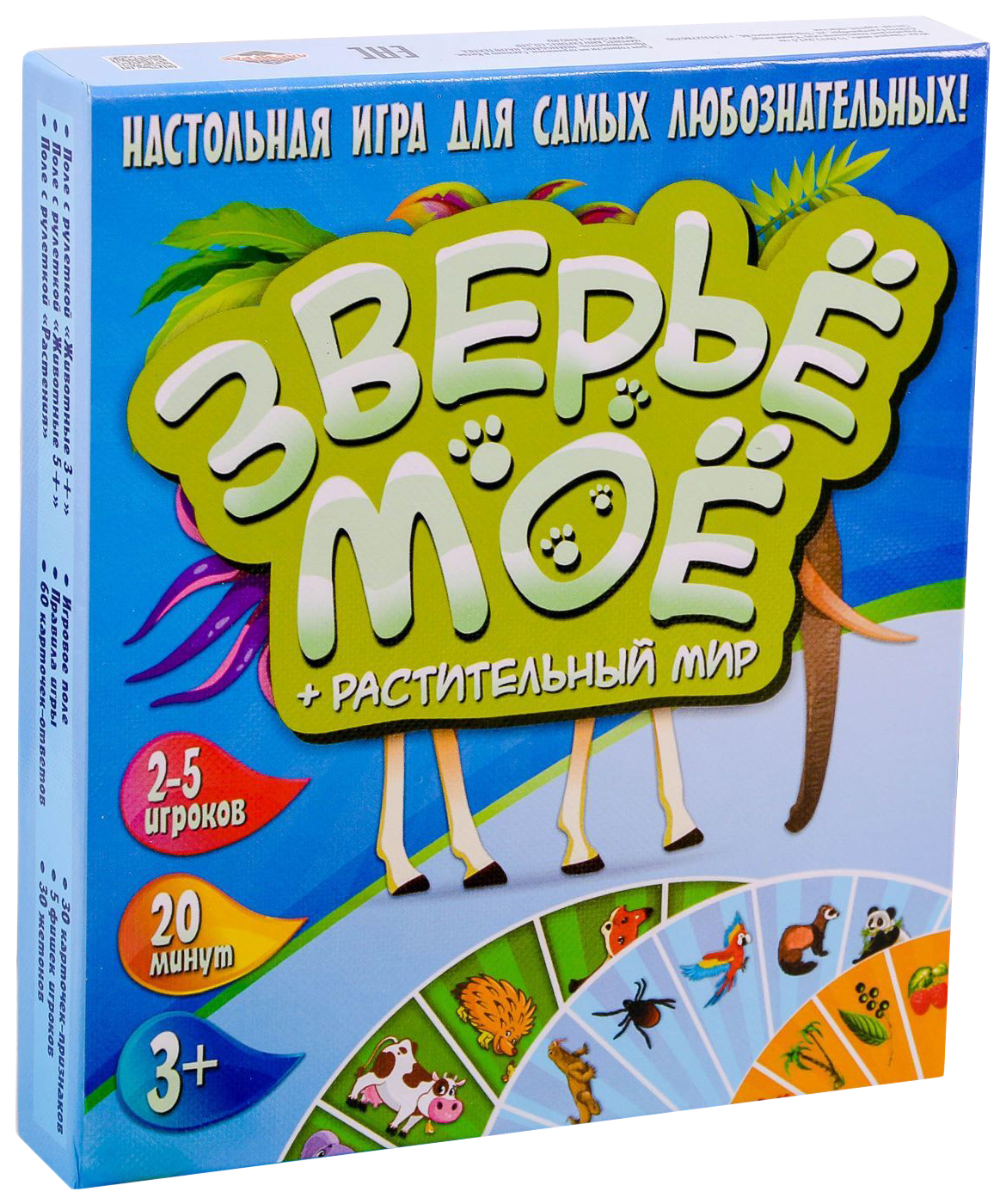 Комплектация30 жетонов; 30 карточек-признаков; 5 фишек игроков; 60 карточек-ответов; Игровое поле; Поле с рулеткой «Животные 3+»; Поле с рулеткой «Животные 5+»; Поле с рулеткой «Растения»; Правила игры