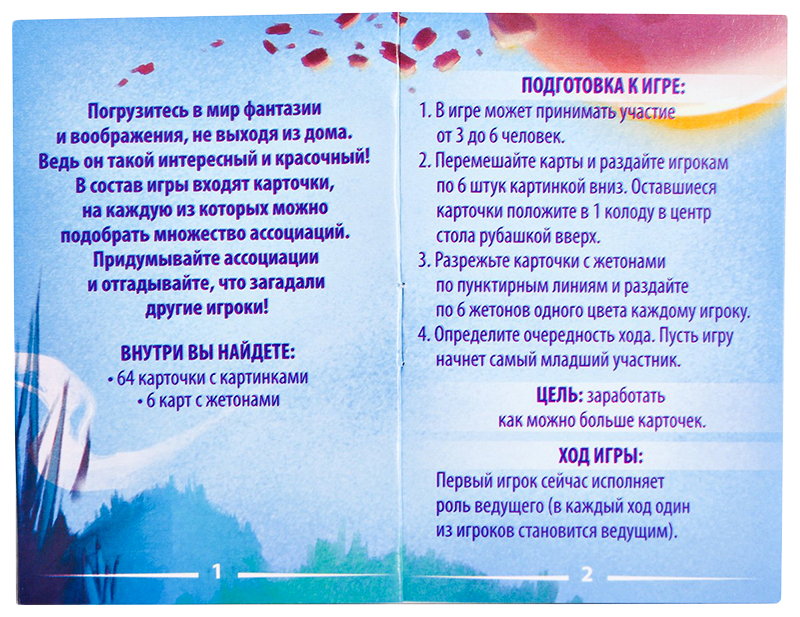 • Комплектация 6 карт с жетонами; 64 карточки с картинками; Правила игры
