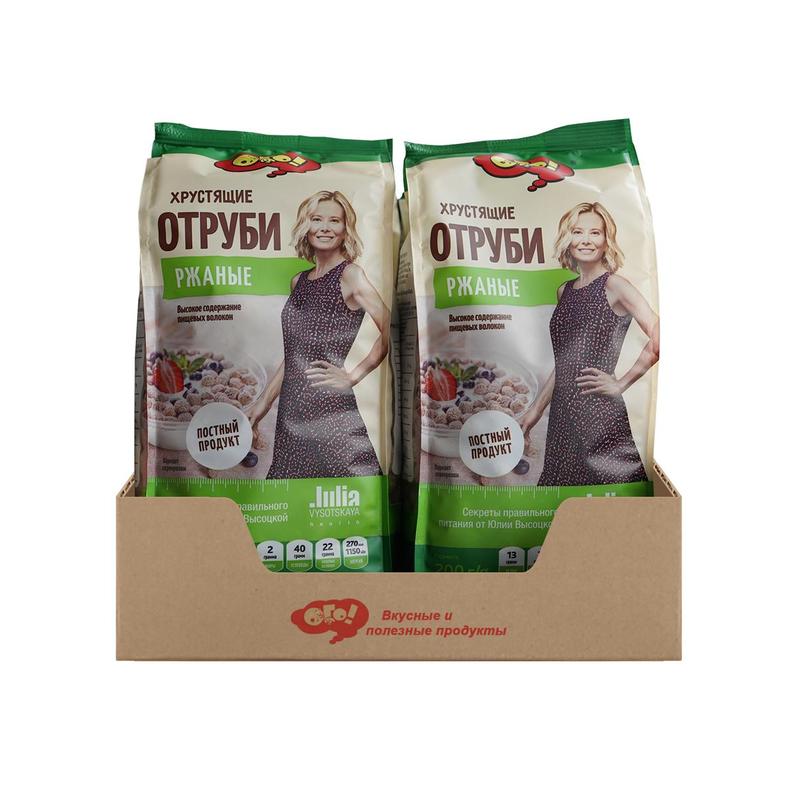 Отруби ржаные экструдированные «Ого!» — продукт, произведенный на основе отрубей ржаных и муки ржаной обдирной, которые отличаются высоким содержанием пищевых волокон, содержат витамины группы В, макро-и микроэлементы.Солод ржаной богат различными минералами (магний, кальций, селен, фосфор и др.) и витаминами Е, А и группы В, оказывающими общеукрепляющее воздействие на организм.Регулярное употребление отрубей способствует выведению из организма шлаков, токсинов, холестерина и тем самым защищает человека от вредного воздействия окружающей среды и развития сердечно-сосудистых заболеваний.Способ употребления: при употреблении в сухом виде запивать достаточным количеством воды или сока. Продукт можно употреблять, добавляя его в первые блюда, компоты, кисели, кефир, йогурт и т. п. Рекомендуется ежедневно употреблять 45–50 г отрубей (6–7 столовых ложек).Состав: отруби ржаные, мука ржаная обдирная, мука пшеничная хлебопекарная 2 сорта, солод ржаной ферментированный, соль поваренная пищевая.Постный продукт!Белки: 13 г/100 г.Жиры: 2 г/100 г.Углеводы: 40 г/100 г.Калорийность: 270 ккал/100 г.Вес нетто одной упаковки: 200 г.Срок хранения: 9 месяцев.Страна-производитель: Россия.