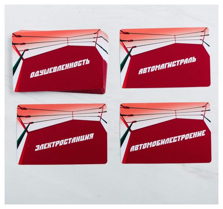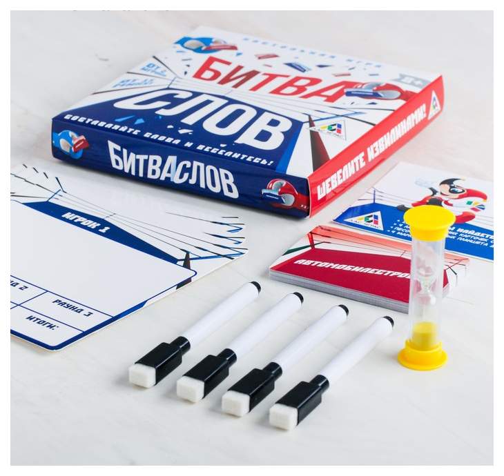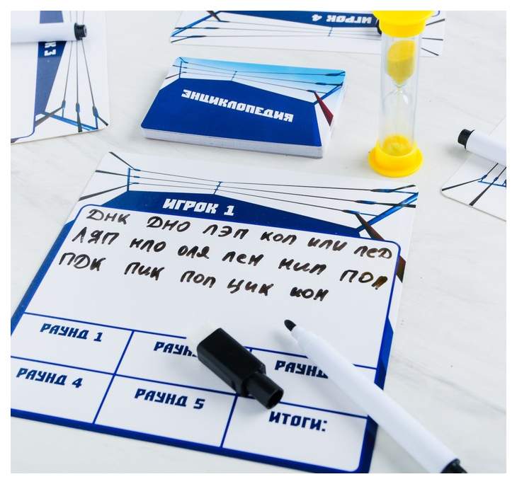 • Комплектация 20 карт со словами; 4 планшета для игроков; песочные часы; 4 маркера