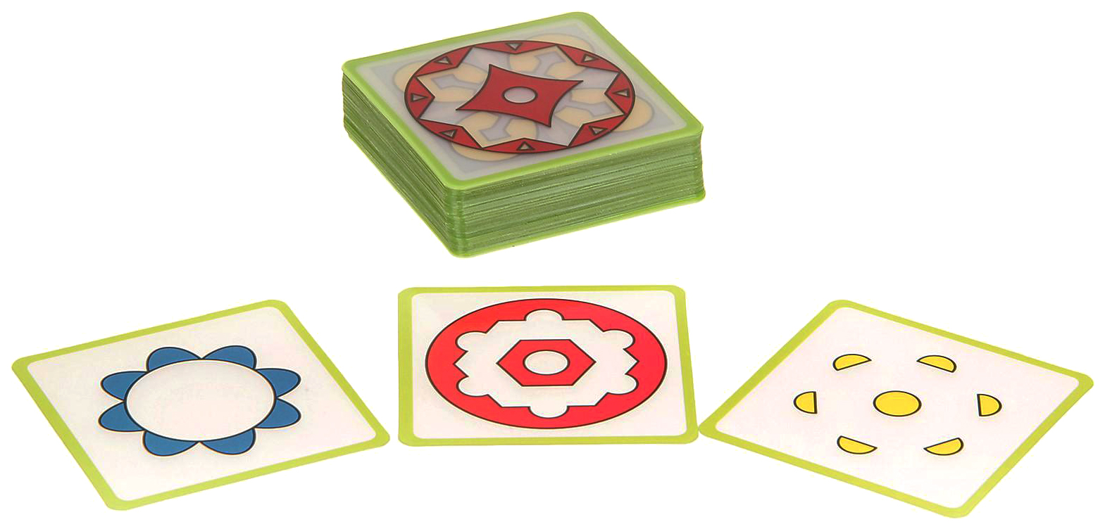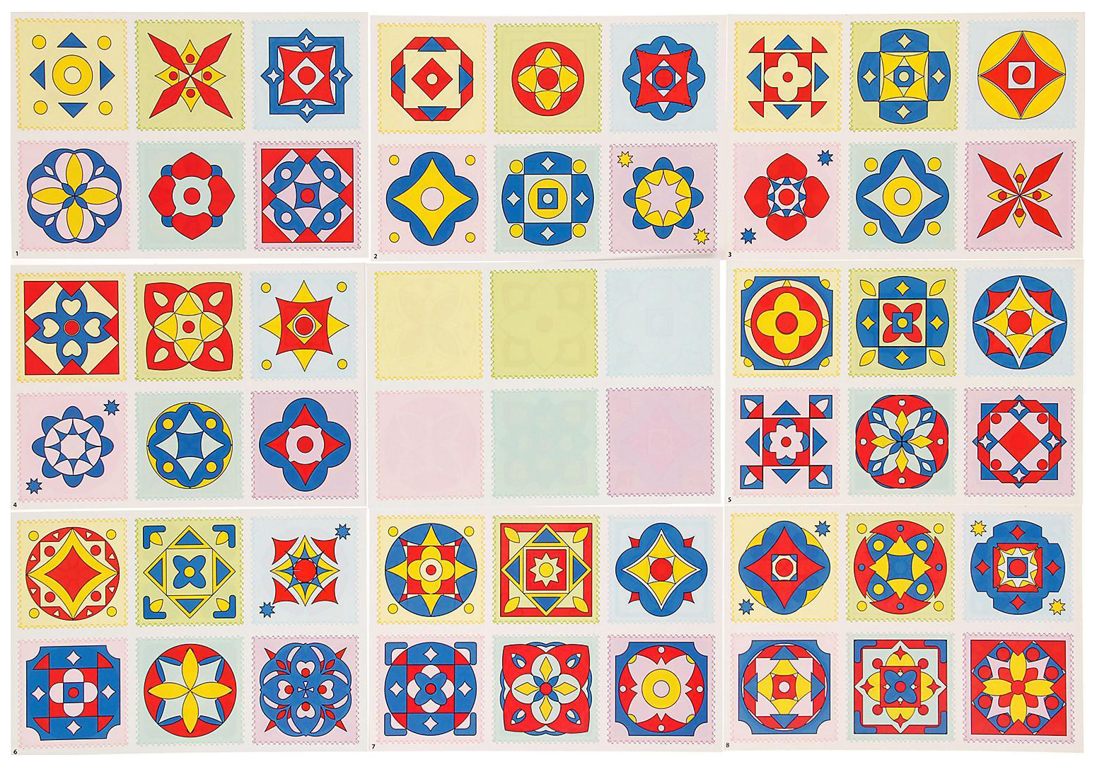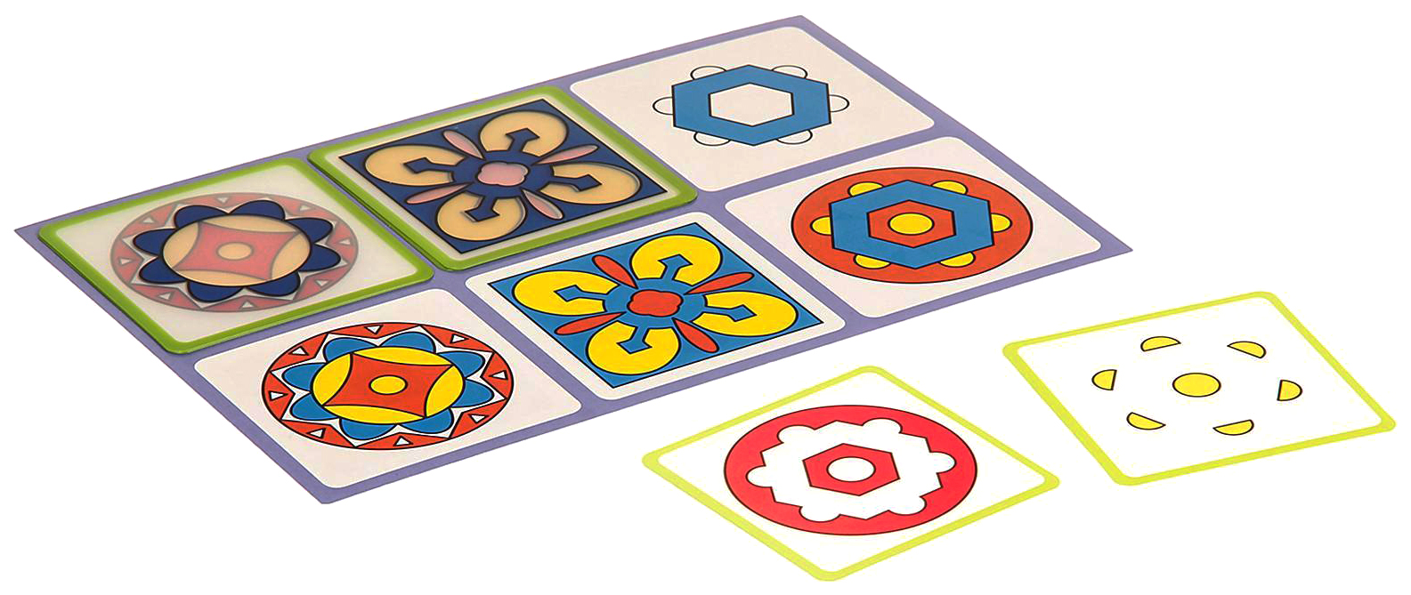 Комплектациялото с прозрачными карточками; блокнот для творчества; игра «Составляем орнаменты»; 9 двусторонних картонных карт-основ; 54 пластиковые прозрачные карточки в мешочке; набор мелков Erich Krause; инструкция для родителей