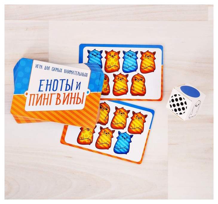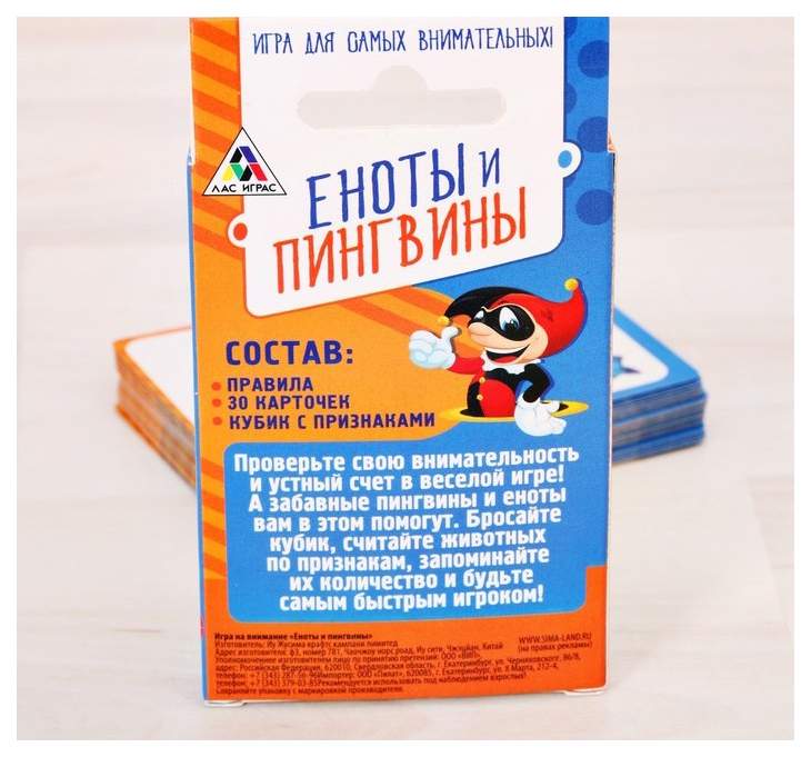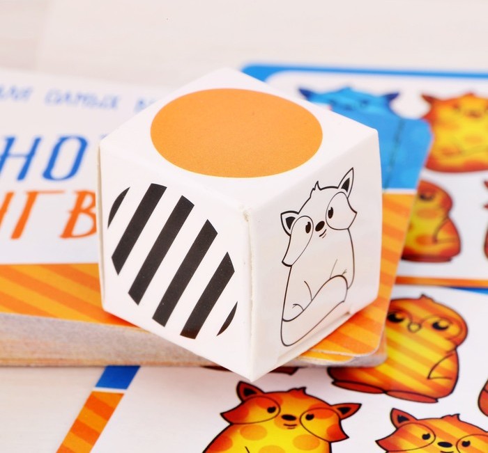 - Комплектация 30 карточек; картонный кубик с цифрами; картонный кубик с признаками; правила игры