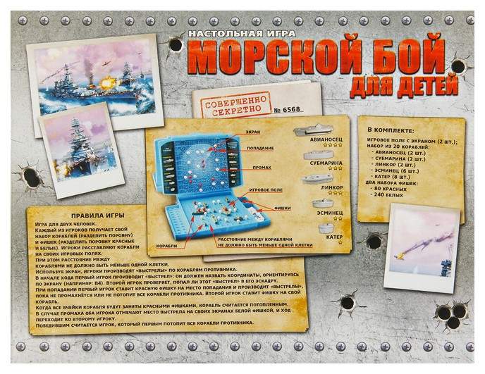 • Комплектация игровое поле с экраном - 2 шт.; корабли - 20 шт.; красные фишки - 80 шт.; белые фишки - 240 шт.