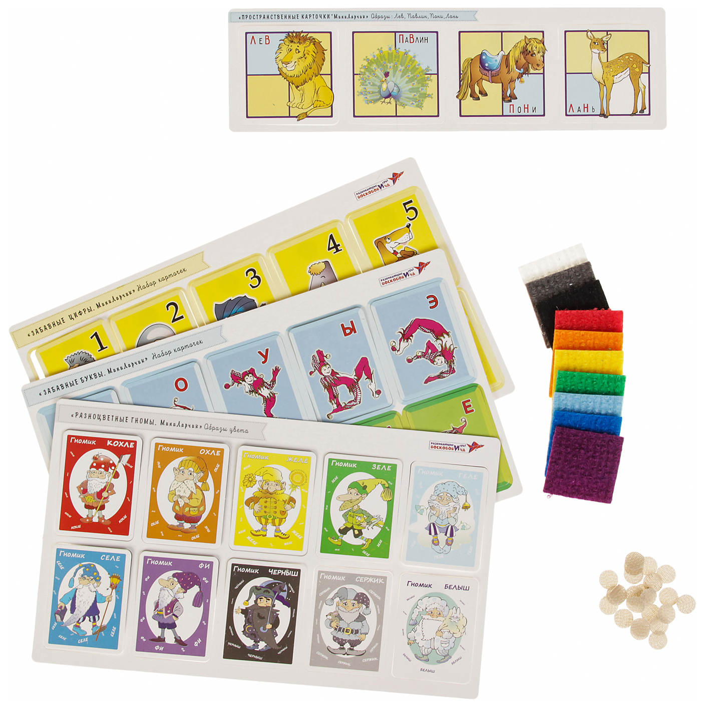 - Комплектация забавные буквы; забавные цифры; разноцветные гномы; пространственные карточки; разноцветные квадраты