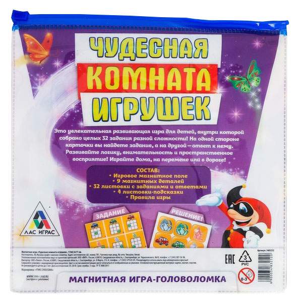 - Комплектация игровое магнитное поле - 1 шт; магнитные детали - 9 шт; листовки с заданиями и ответами - 32 шт; листовки-подсказки - 4 шт; правила игры