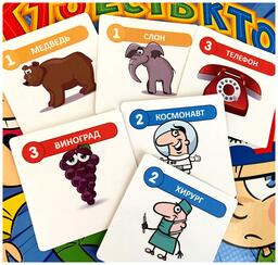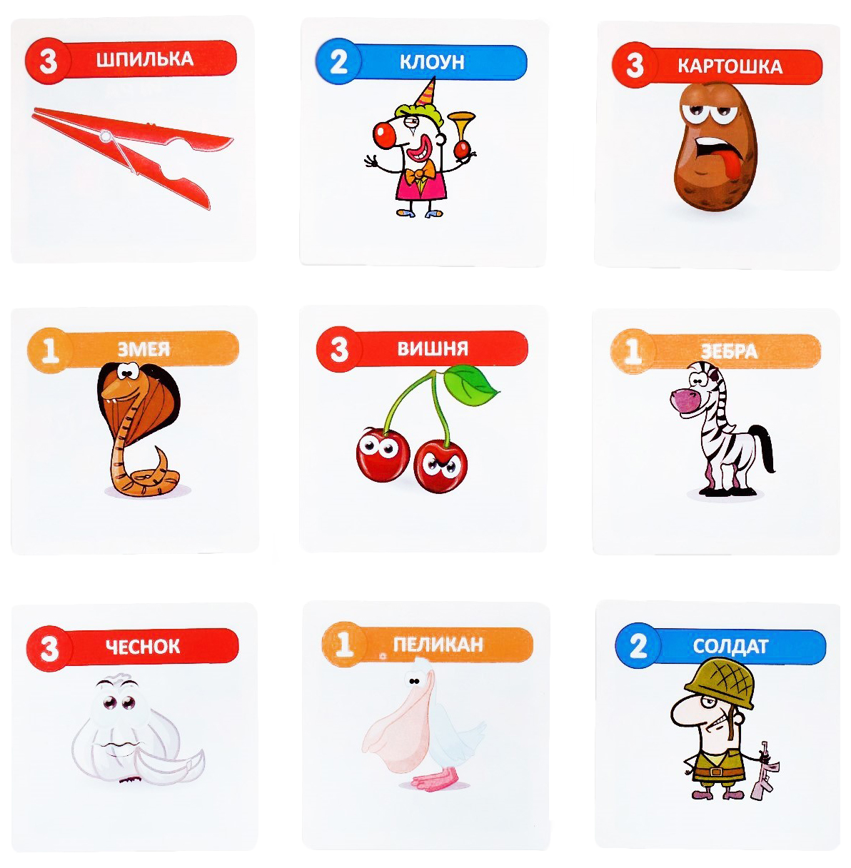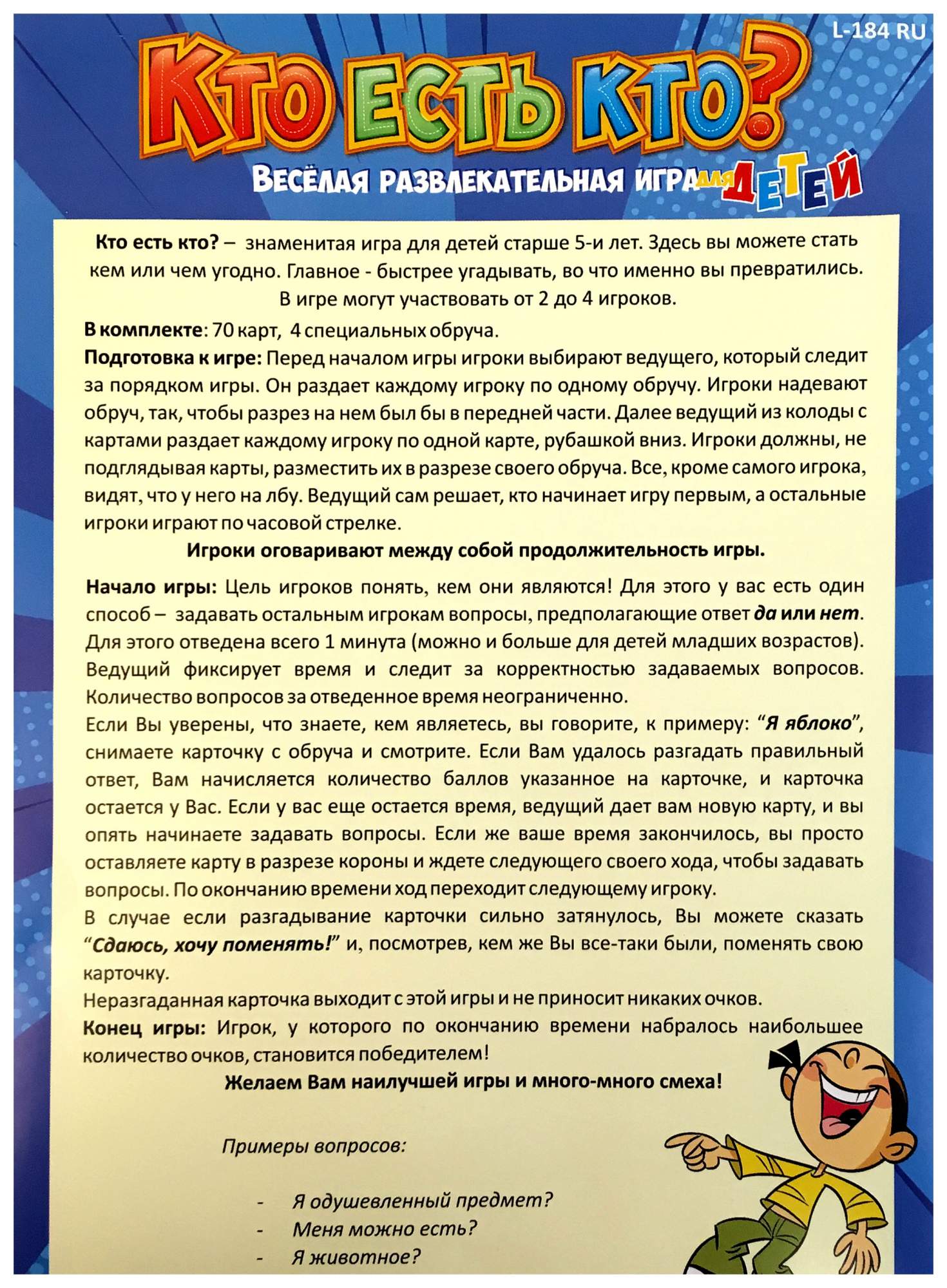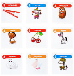 • Комплектация 70 карт с надписями разных персонажей; 4 специальных обруча; правила к игре