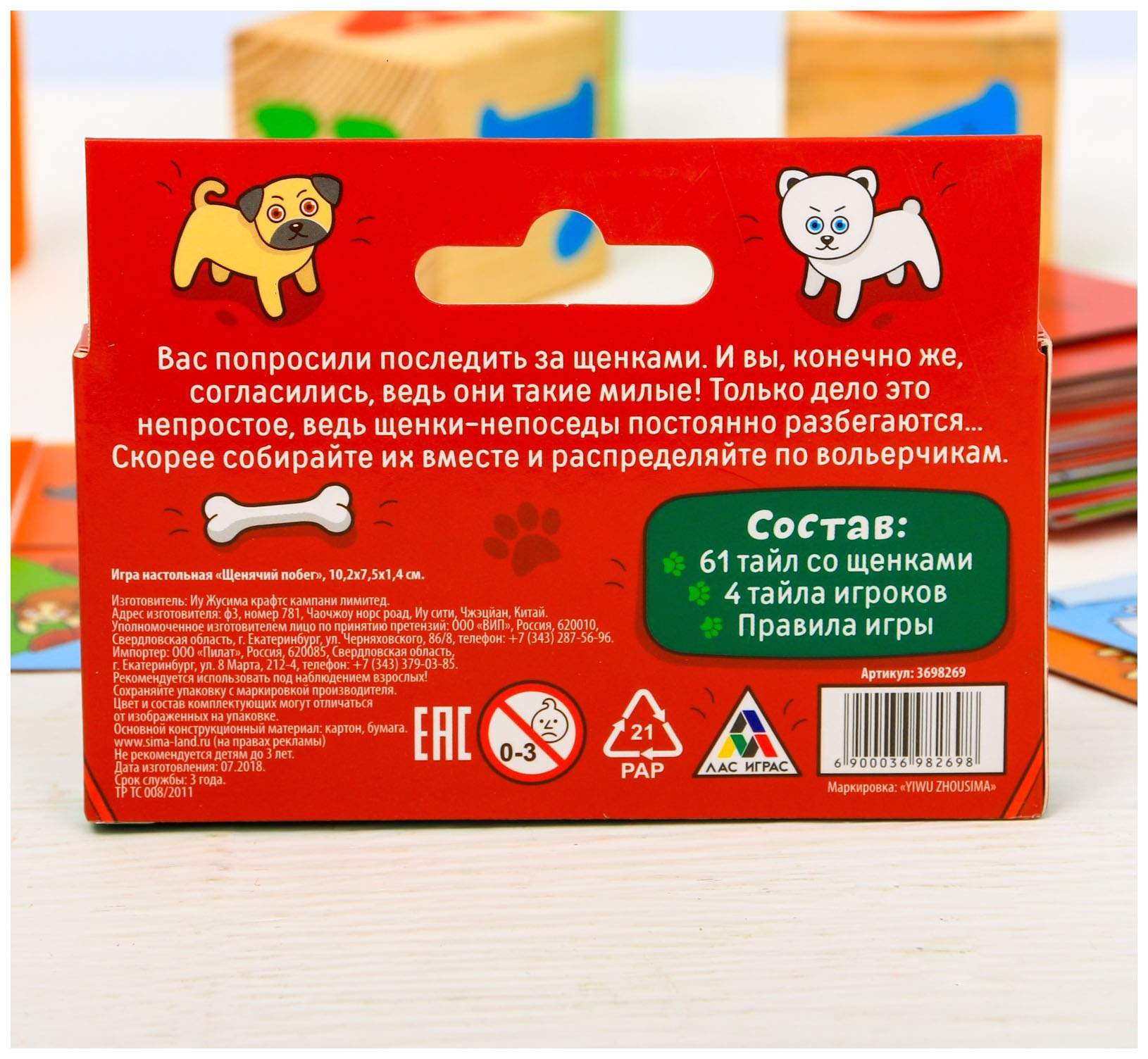 - Комплектация 61 тайл со щенками; 4 тайла игроков; правила игры