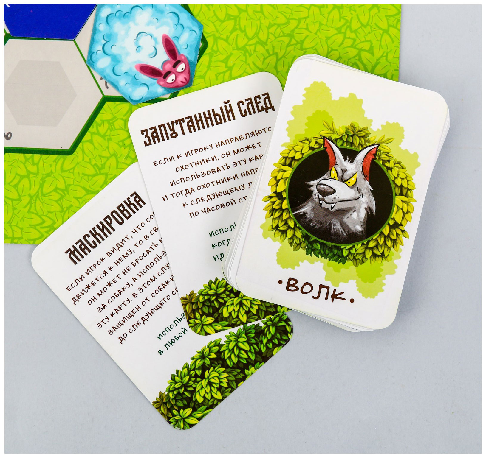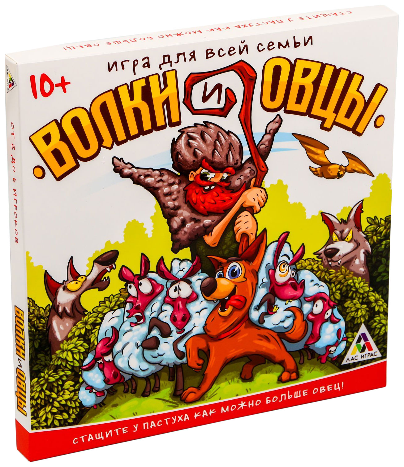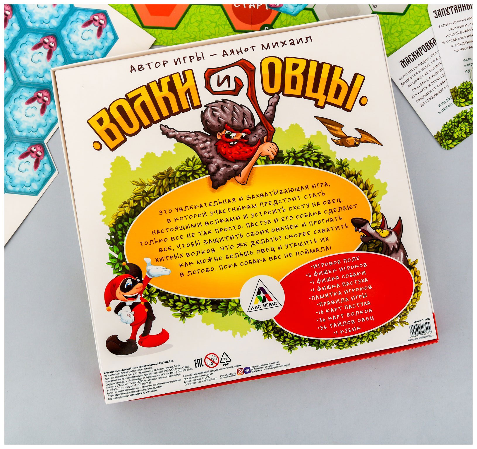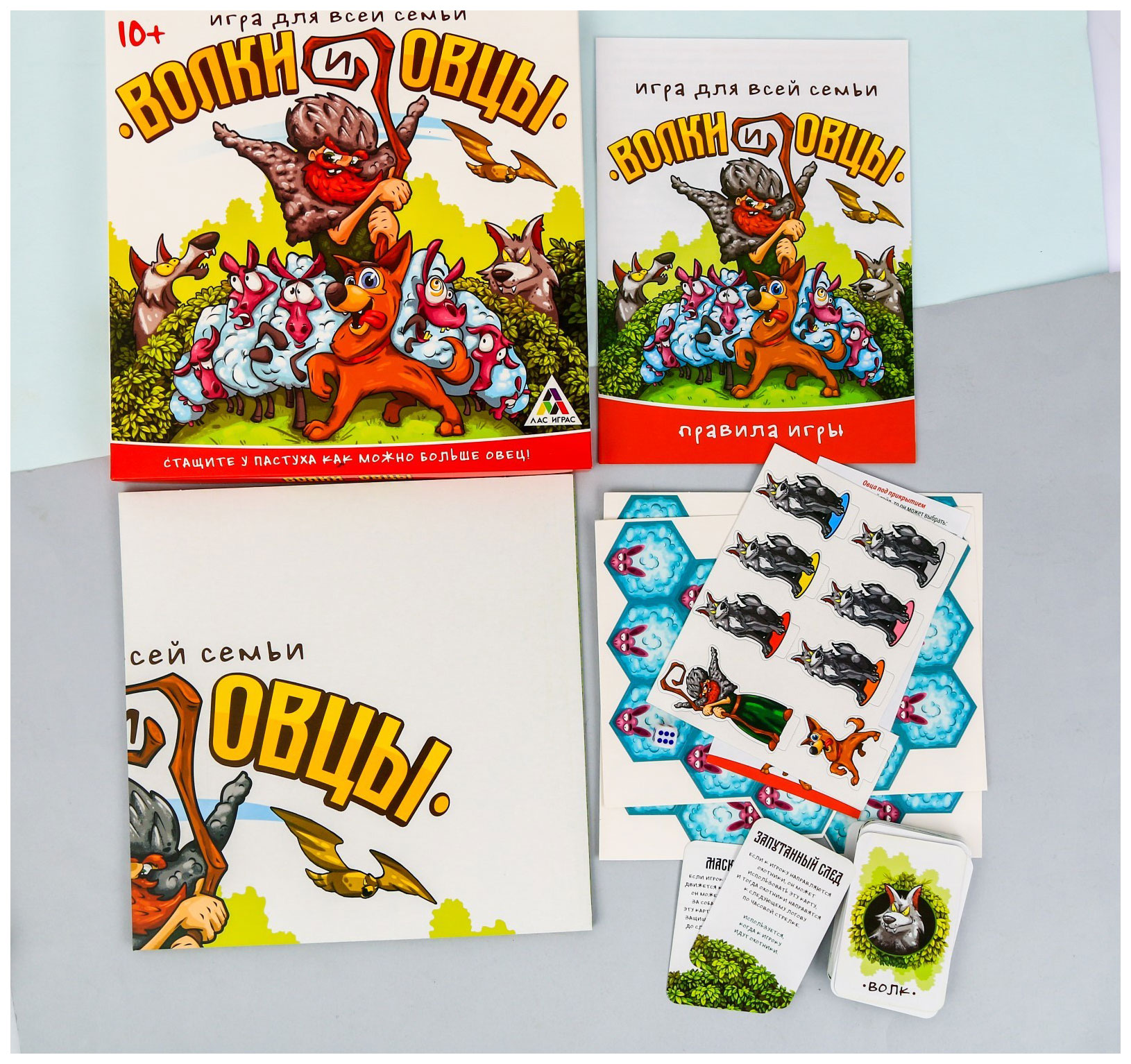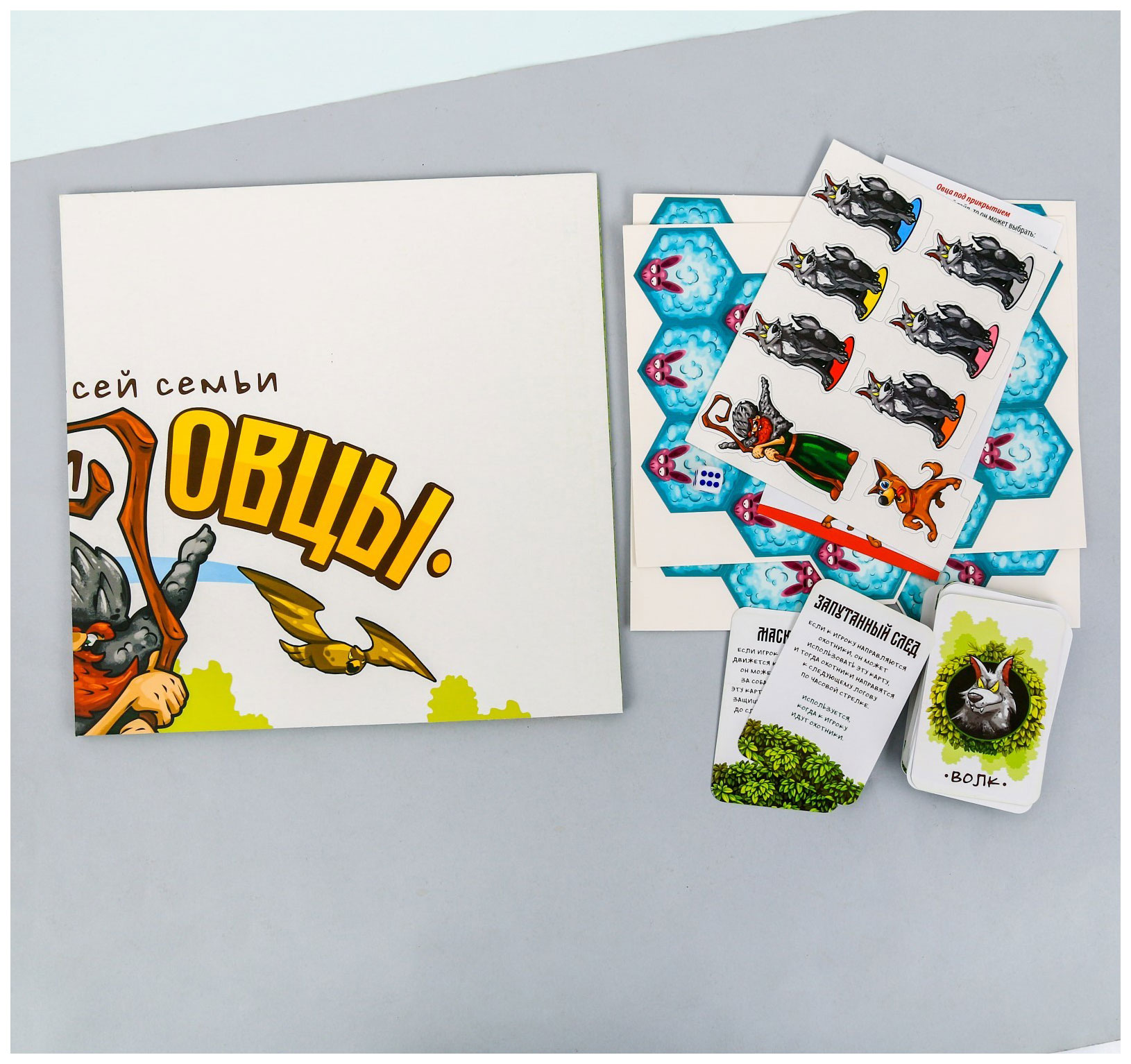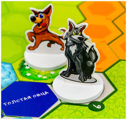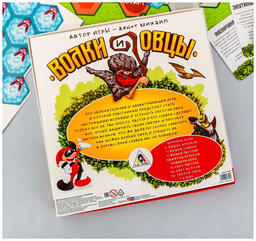 • Комплектация игровое поле; 6 фишек участников; фишку собаки; 10 карт пастуха; 36 карт волков; 37 тайлов овец; кубик; памятку для игроков; правила
