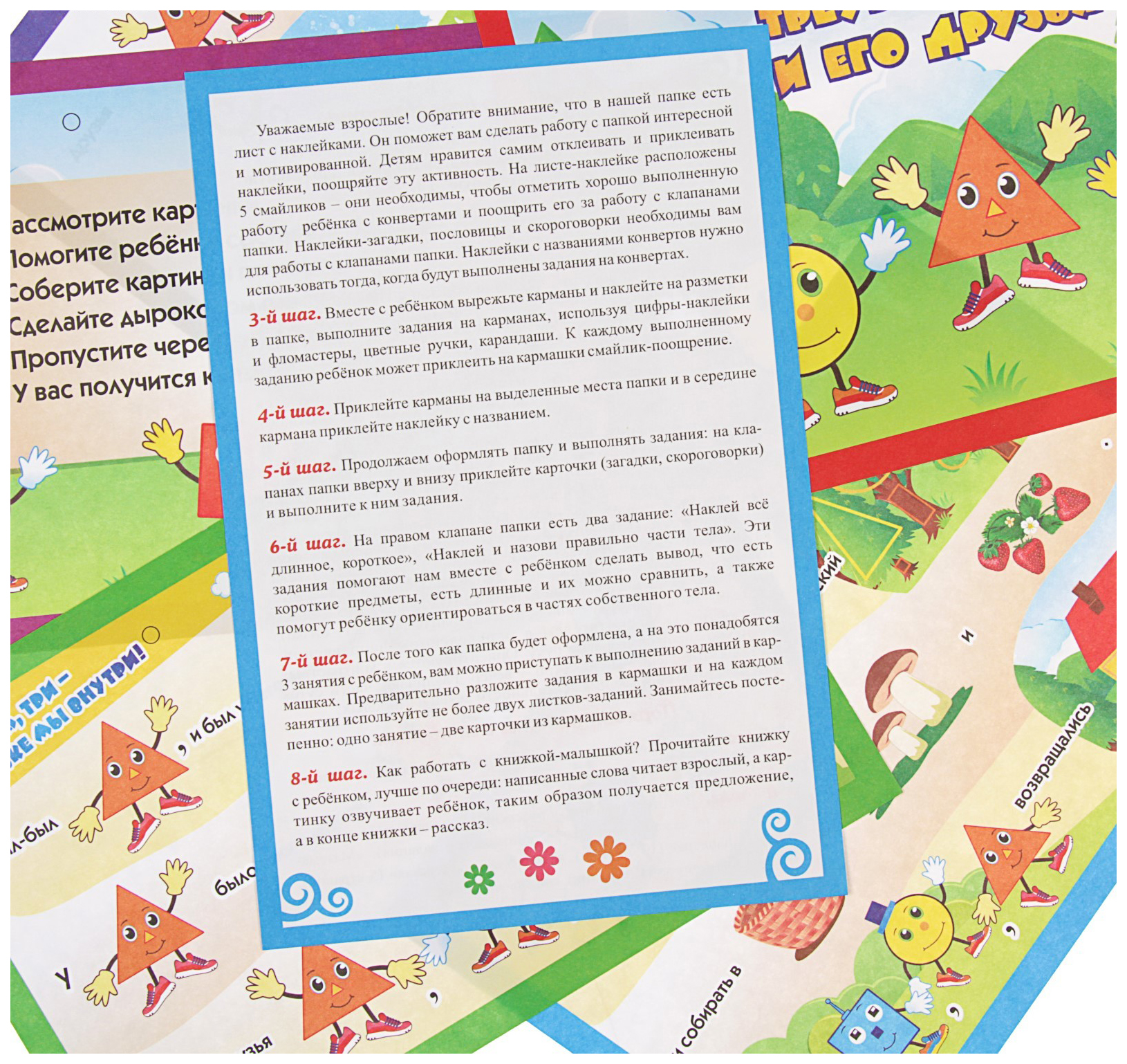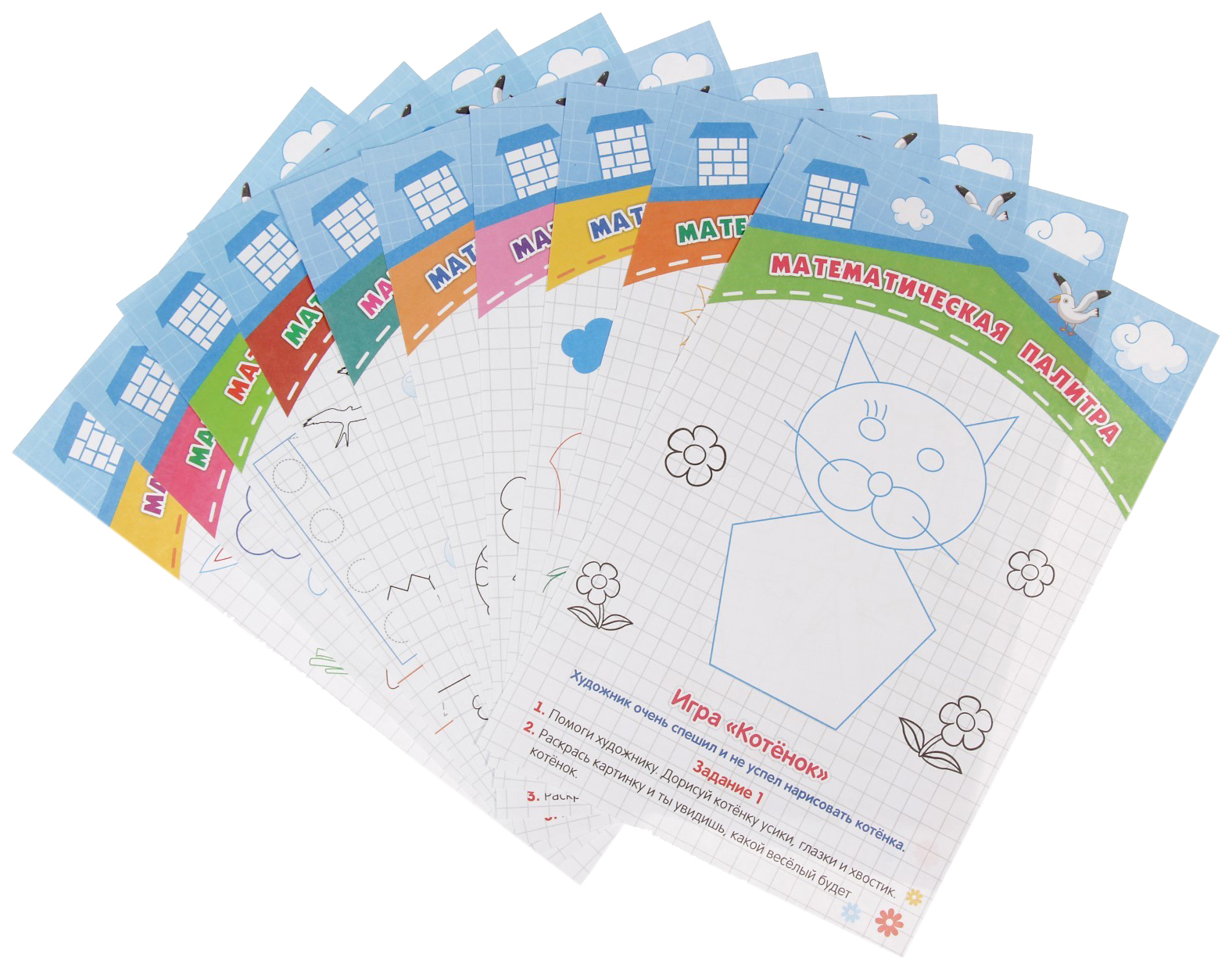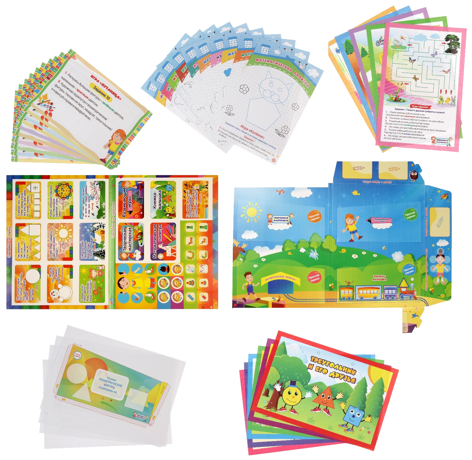 КомплектацияЗаготовки для кармашков и для книжки-самеделки; Игры-загадки; Карточки-задания с математическими кроссвордами‚ графическим диктантом, дорисовкой фигур и цифр; Пословицы о цифрах с наклейками; Разукрашки; Ребусы; Шкала достижений и смайлики