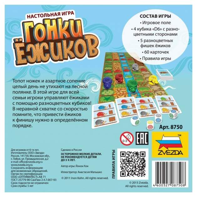 • Комплектация 4 кубика D6; 5 фишек ёжиков; 60 карточек; Игровое поле; Правила