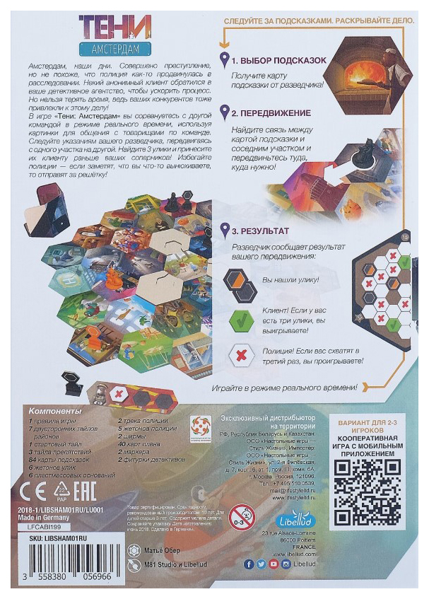 - Комплектация 1 стартовый тайл; 2 маркера; 2 трека полиции; 2 фигурки детективов; 2 ширмы; 3 тайла препятствий; 40 карт плана; 5 жетонов полиции; 6 жетонов улик; 6 пластмассовых оснований; 7 двусторонних тайлов районов; 84 карты подсказок; Правила игры