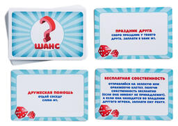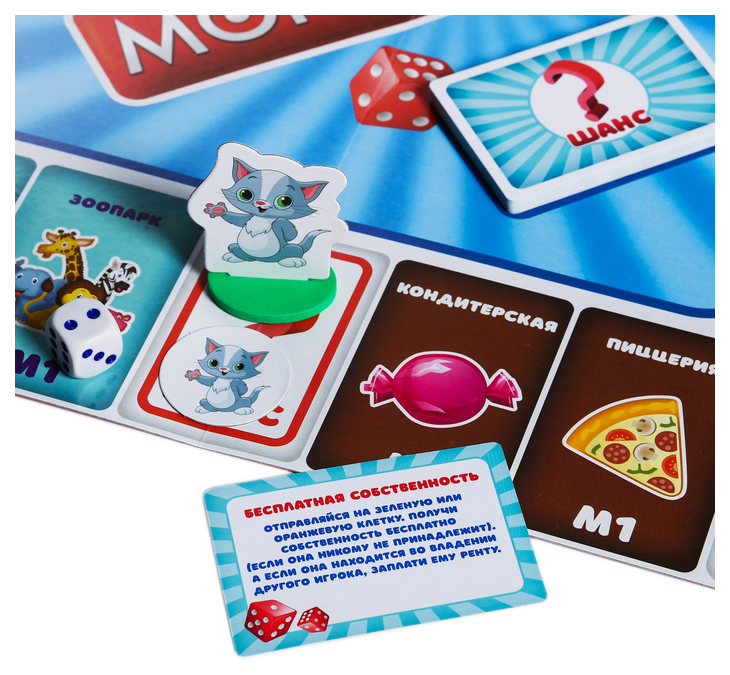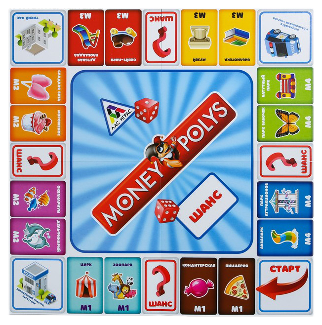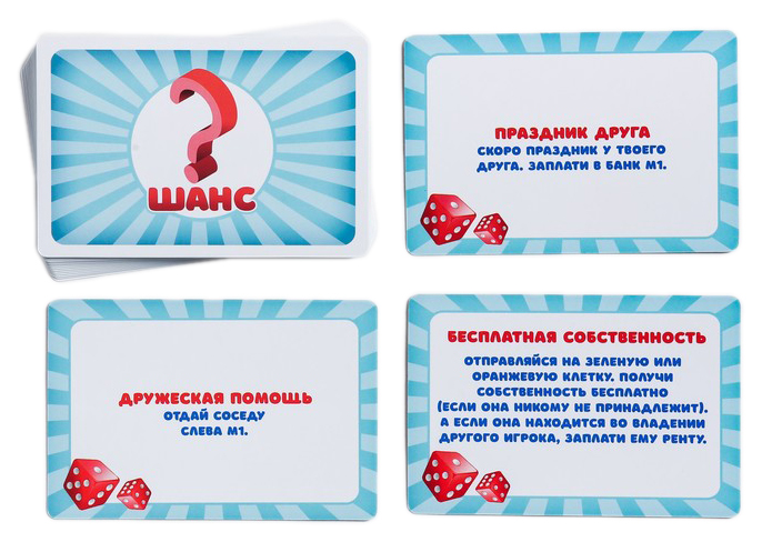 • Комплектация игровое поле - 1 шт.; фишки игроков - 4 шт.; карты «Шанс» - 20 шт.; жетонов игроков - 48 шт.; купюр - 90 шт.; игральный кубик - 1 шт.; правила игры - 1 шт.