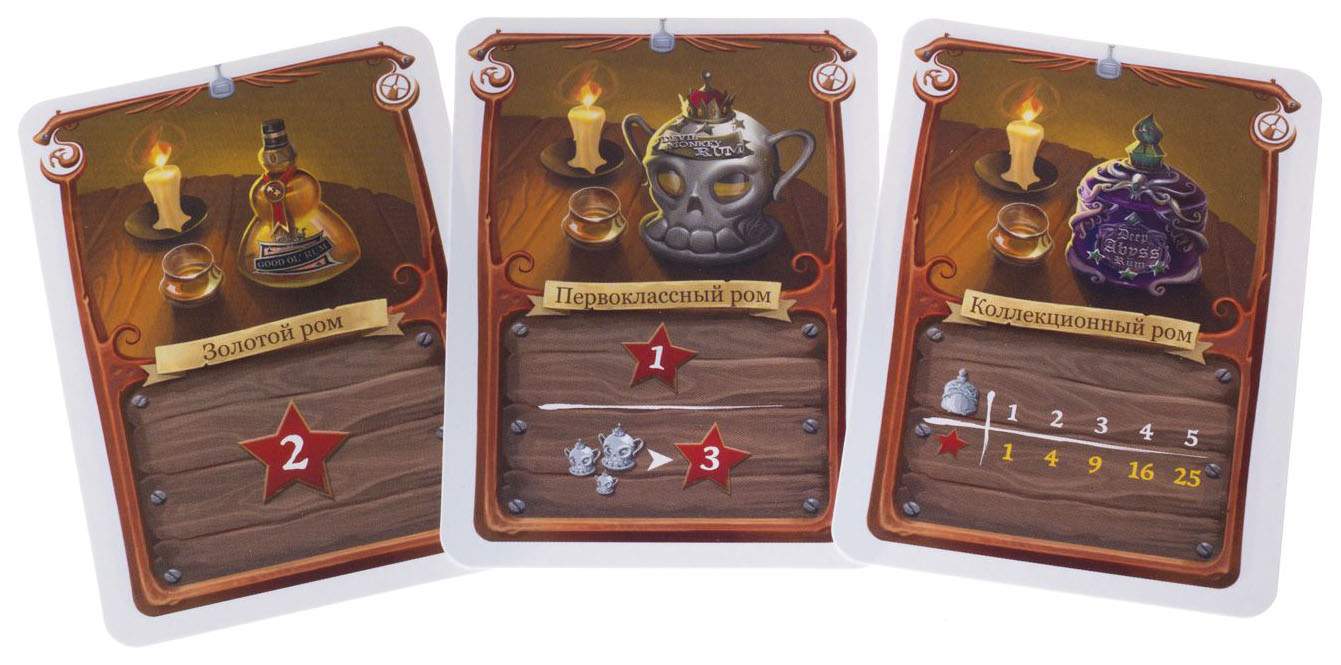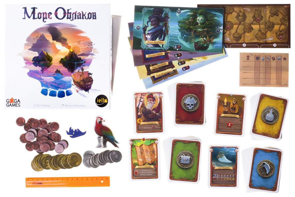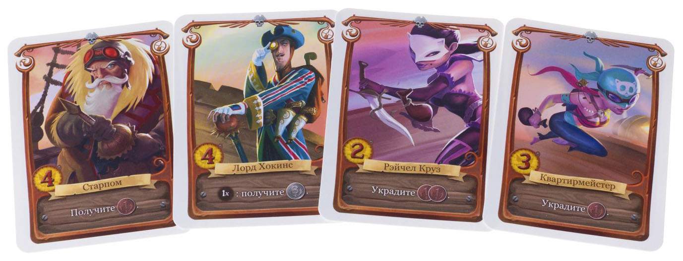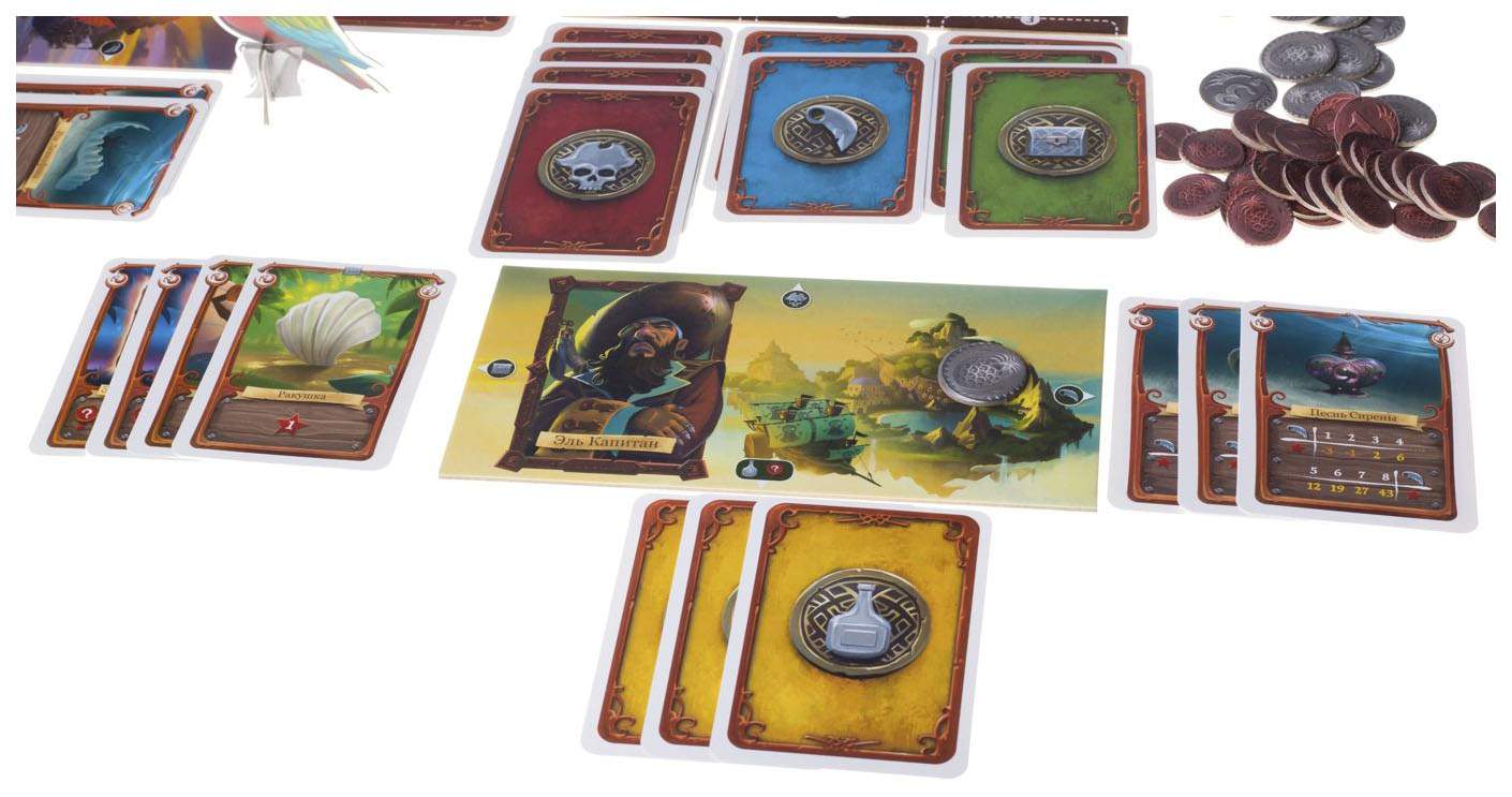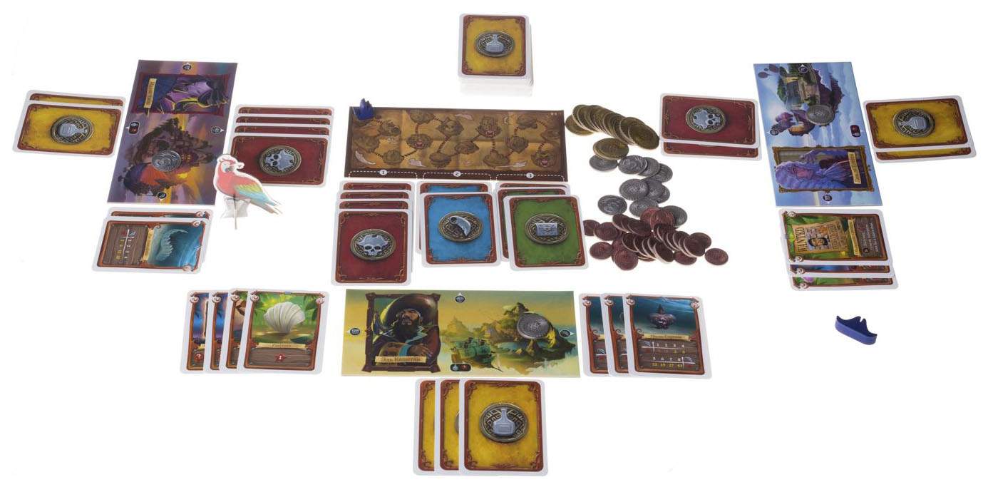 • Комплектация 94 карты добычи; 65 дублонов; 1 фишка корабля; 4 планшета капитана; 1 центральное поле; 1 жетон попугая; 1 фишка шляпы; блокнот для подсчета очков; правила игры