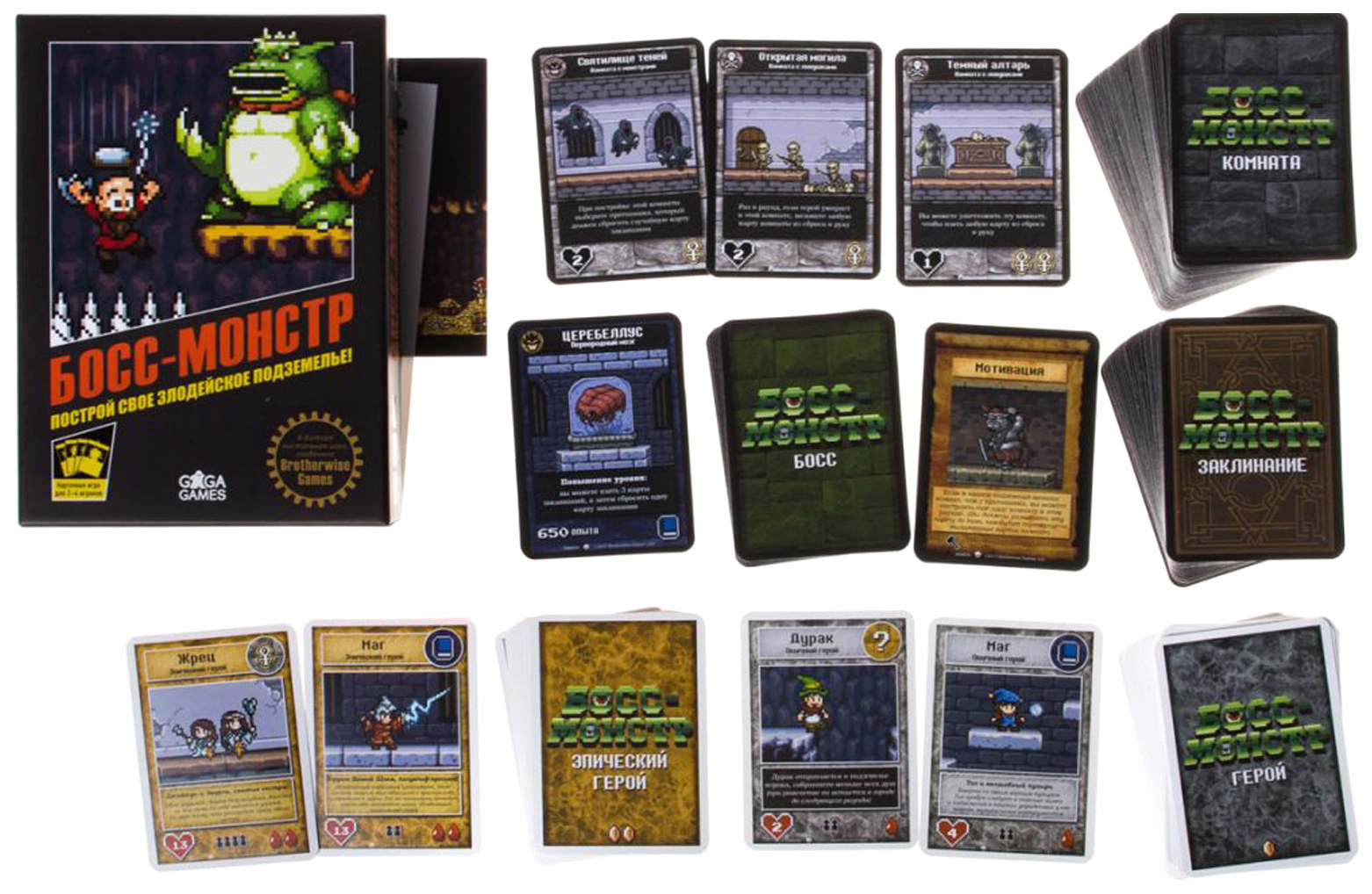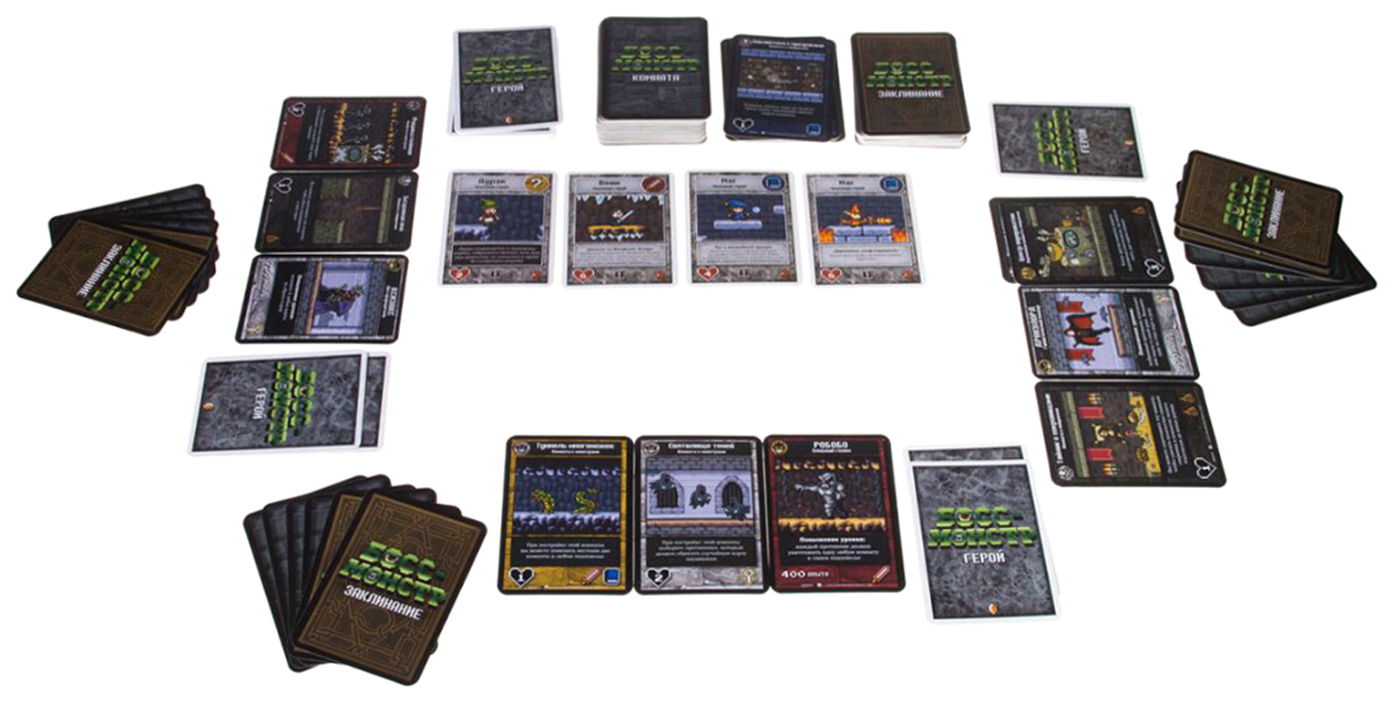 - Комплектация карты комнат - 75 шт; карты боссов - 8 шт; карты заклинания - 31 шт; карты обычных героев - 25 шт; карты эпических героев - 16 шт; руководство по быстрому старту; правила