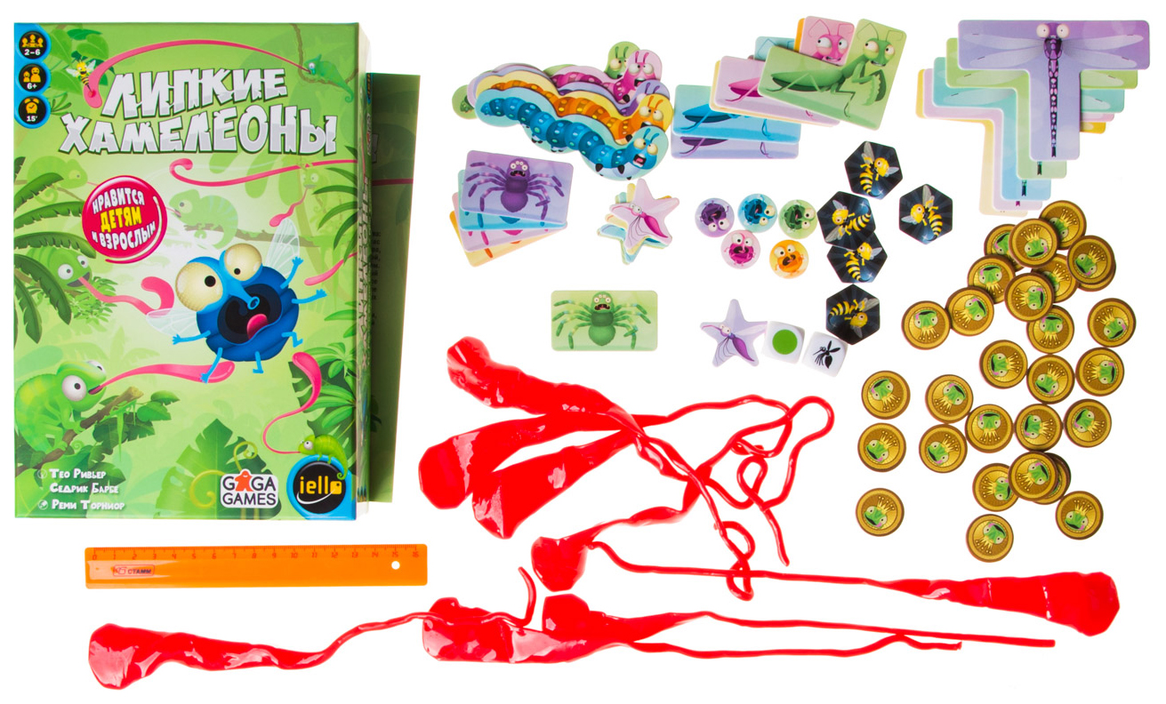 • Комплектация 8 липких языков; 30 жетонов насекомых; 5 жетонов ос; 30 жетонов вкусняшек; 1 кубик насекомых; 1 кубик цвета; правила