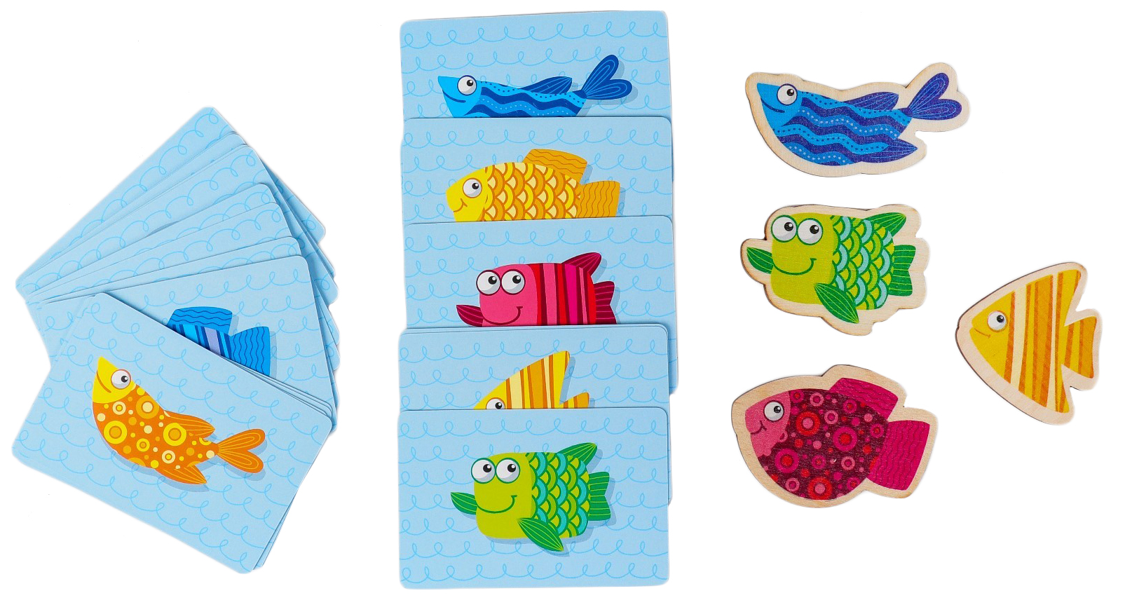 - Комплектация 32 карточки; 4 фигурки рыбок из фанеры; Правила игры