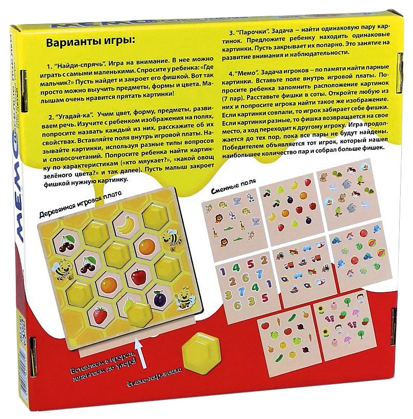 • Комплектация Двухстороннее сменное поле (20х22 см) 4 шт; Деревянная игровая плата (23х22 см); Фишки-закрывашки 14 шт