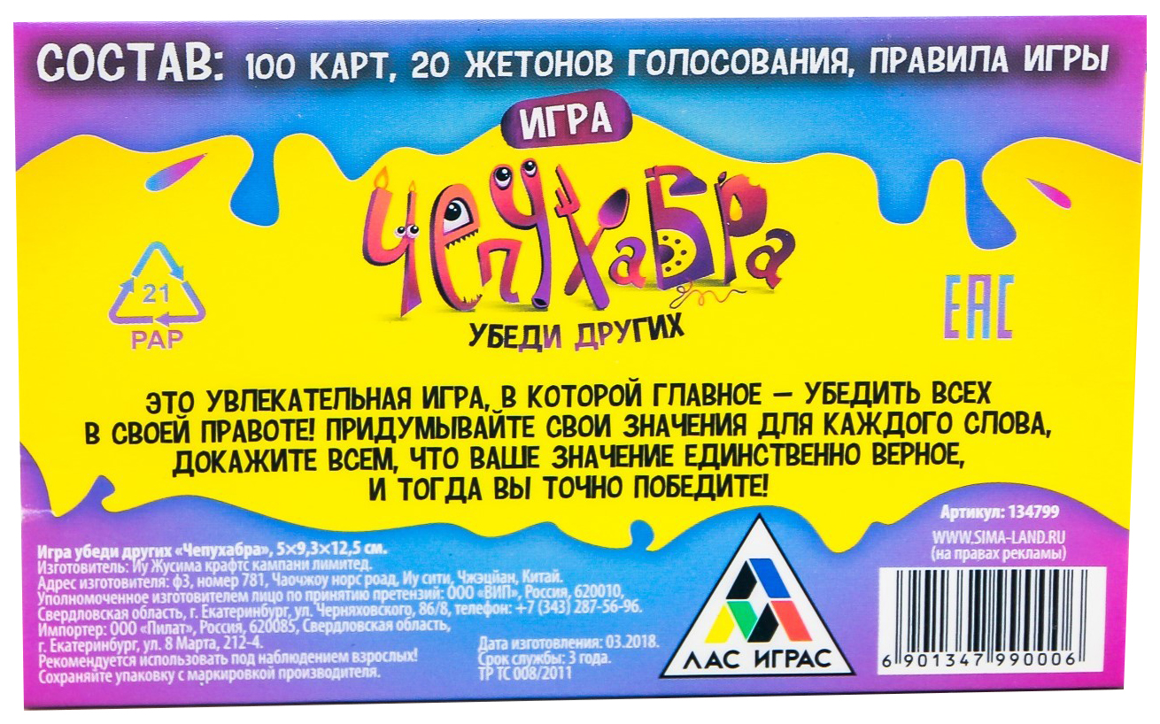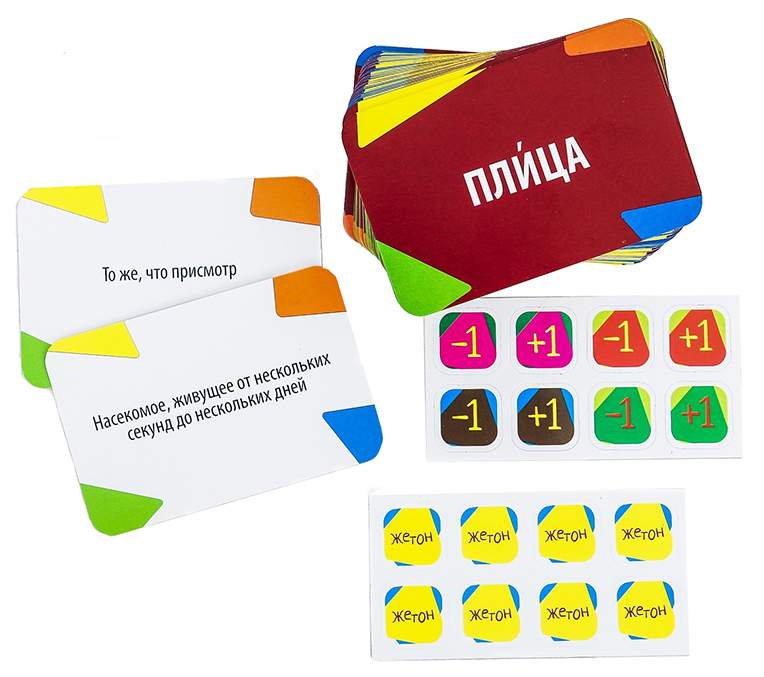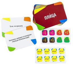 - Комплектация 100 карточек со словами и их значениями, 20 жетонов для голосования, правила игры.