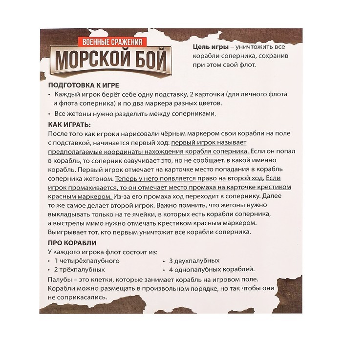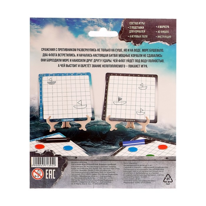 • Комплектация подставка для кораблей; игровое поле; маркер; фишки; инструкция
