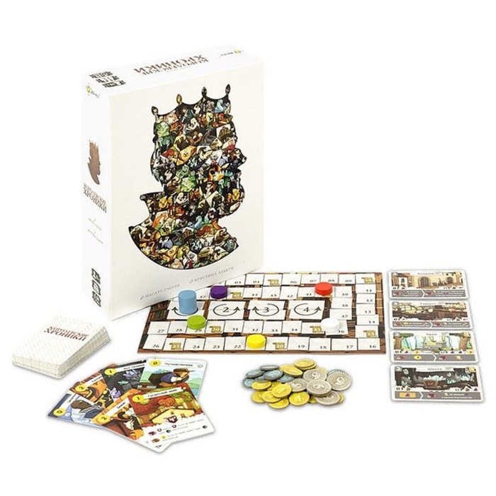 - Комплектация 81 карточка Персонажа, 25 карточек Зданий, 5 Памяток, Поле подсчета очков, 6 деревянных маркеров, 40 жетонов Золота, 30 жетонов Старения
