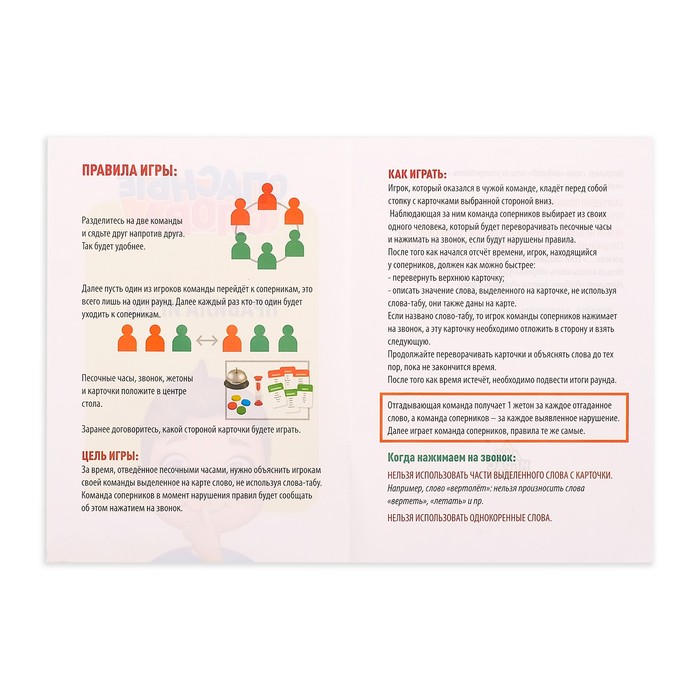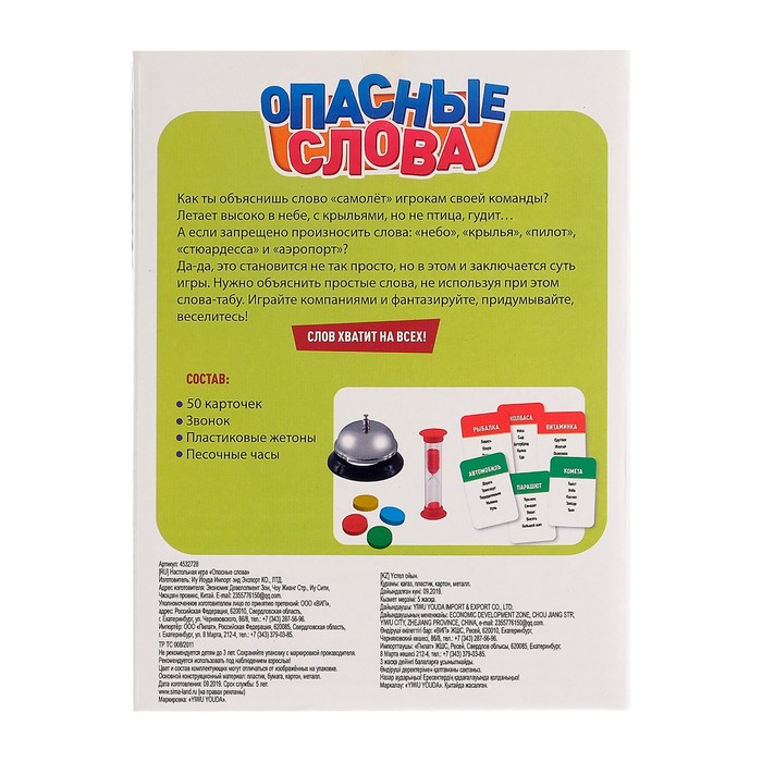 • Комплектация пластиковые жетоны; 50 карточек; звонок; правила игры; песочные часы