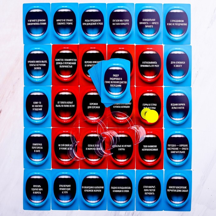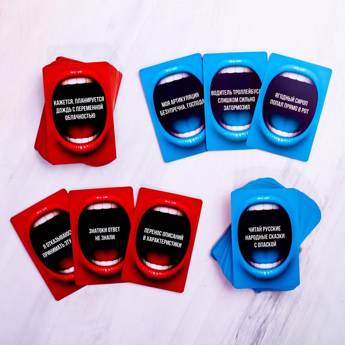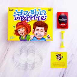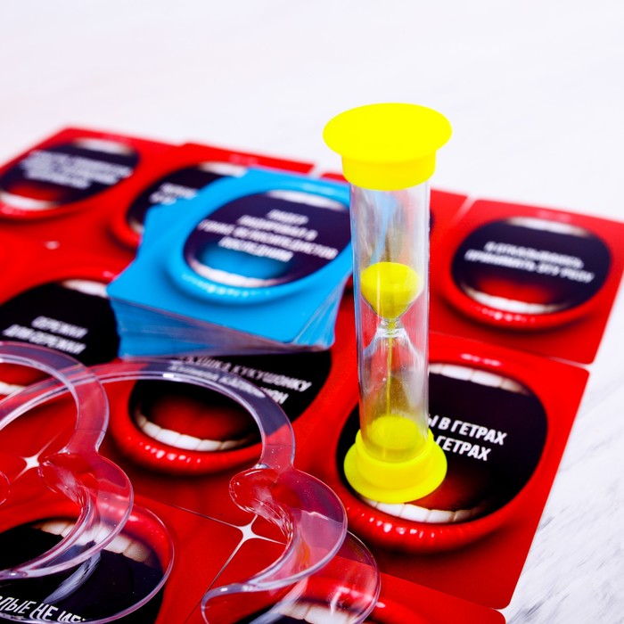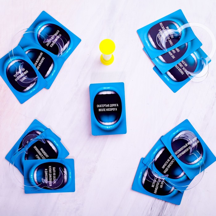 • Комплектация 100 двухсторонних карт, 6 загубников, песочные часы, правила игры.