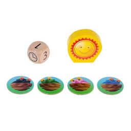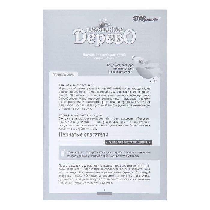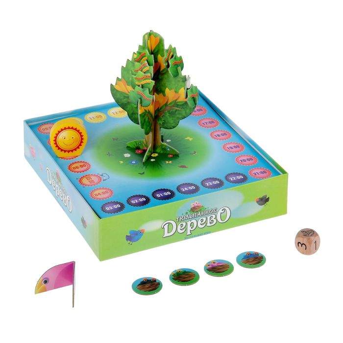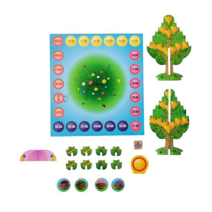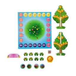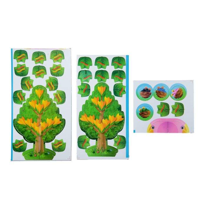 Комплектациядвусторонний игровой планшет, 2 части декорации «Тюльпанное дерево», 4 жетона-гнезда, 24 жетона-листочка с гусеницами (24 шт.), пинцет-клюв, деревянная фишка «Солнце», деревянный кубик с цифрами и заданиями, правила игры