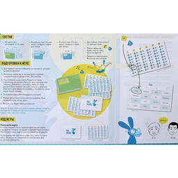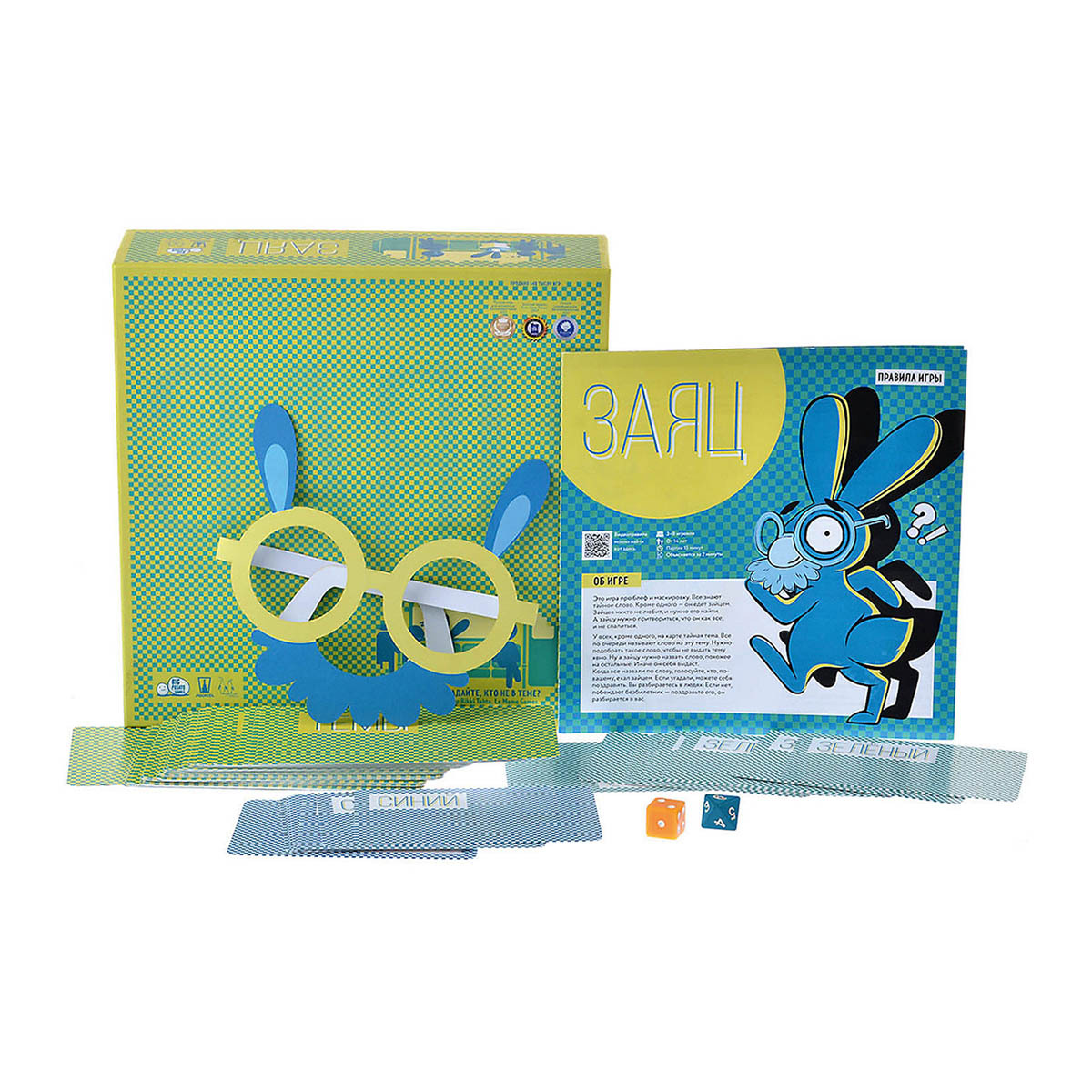 • Комплектация 43 игровых карточек; 8 зелёных карт; 8 синих карт; 2 кубика; маска зайца; инструкция