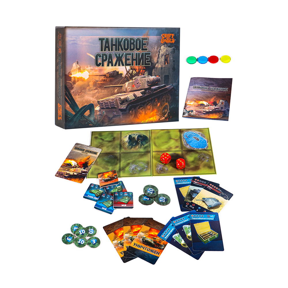 - Комплектация карты танков - 16 шт, карты улучшений - 8 шт, жетоны прочности - 24 шт, жетоны танков - 16 шт, картонные тайлы местности - 4 шт, разноцветные фишки тактической метки - 4 шт, шестигранный кубик - 2 шт, правила игры - 1 шт