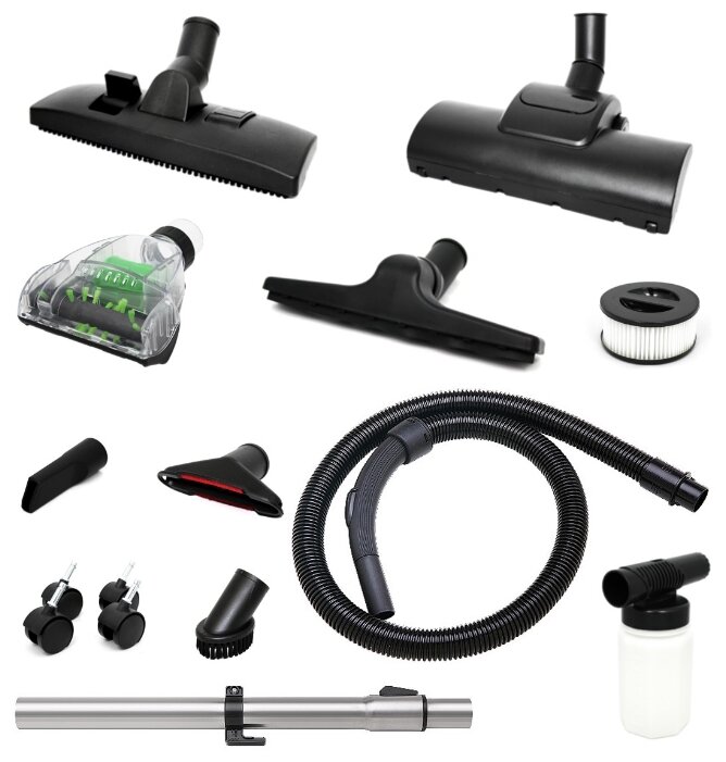 - Насадки в комплекте пол/ковер; щелевая; для мягкой и корпусной мебели, круглая для оргтехники, для сбора жидкости